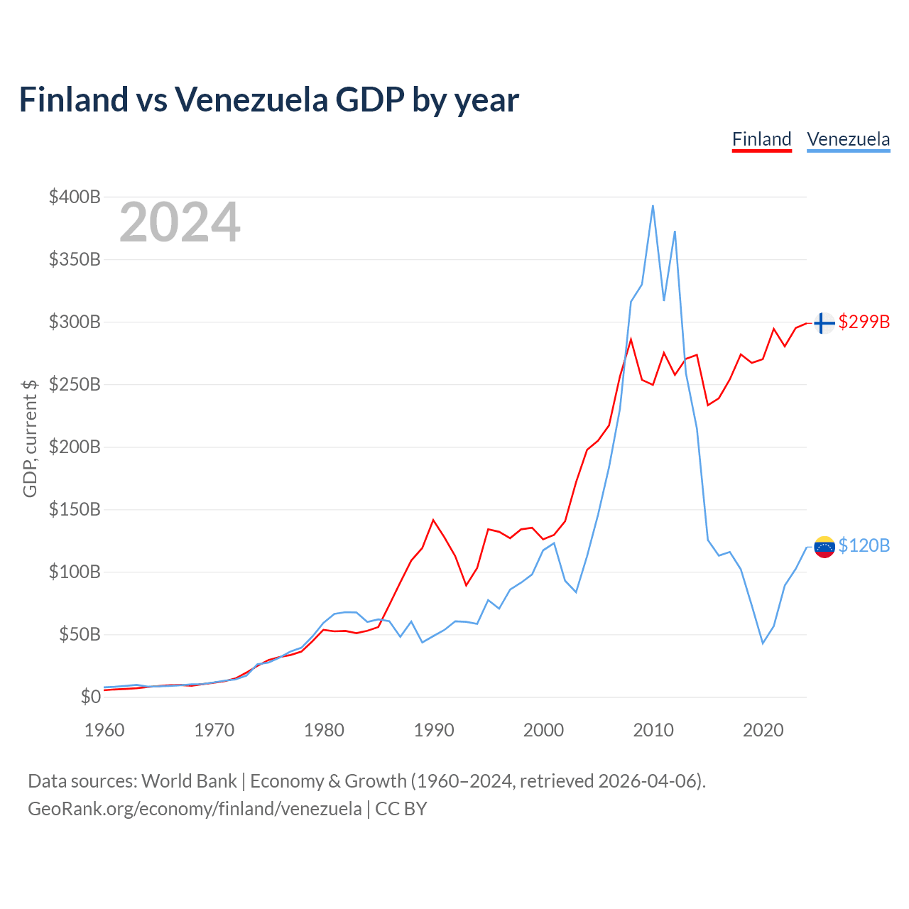 Finland has a GDP of $299B compared to $120B for Venezuela, ranking 47/197 and 65/197 by economy size, respectively.