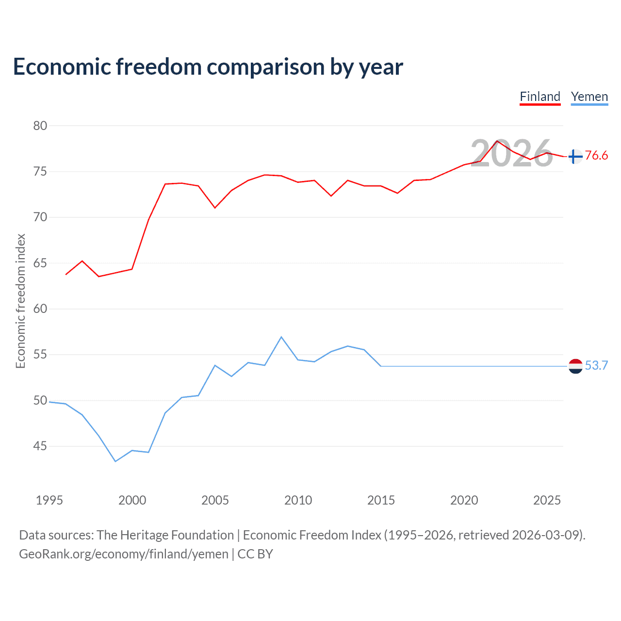 The Economic Freedom Index for Finland is 76.6, ranking 15/197, compared to 53.7 for Yemen, ranking 138/197. The chart above displays a comparison of annual changes in economic freedom indexes.