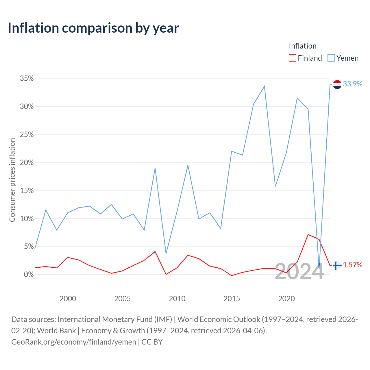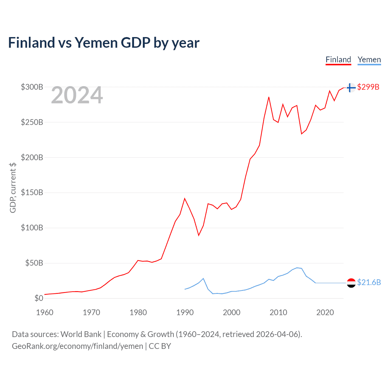 Finland has a GDP of $299B compared to $21.6B for Yemen, ranking 47/197 and 125/197 by economy size, respectively.