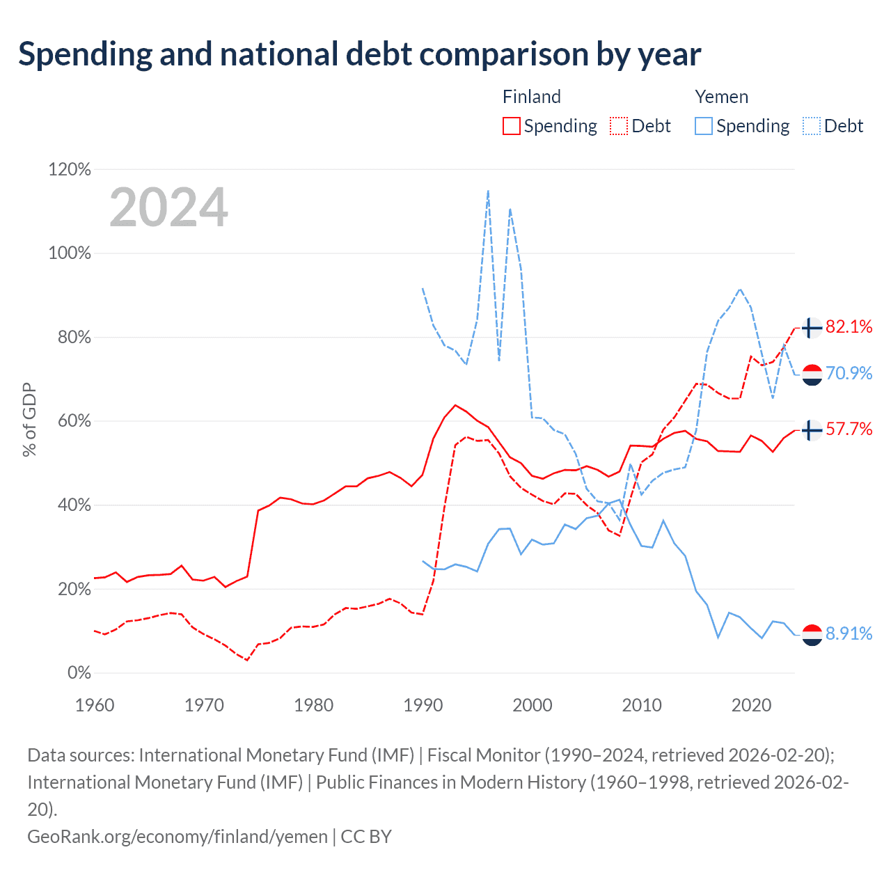 Finland has $245B in government debt (82.1% of GDP), compared to $18.8B (70.9% of GDP) in Yemen.