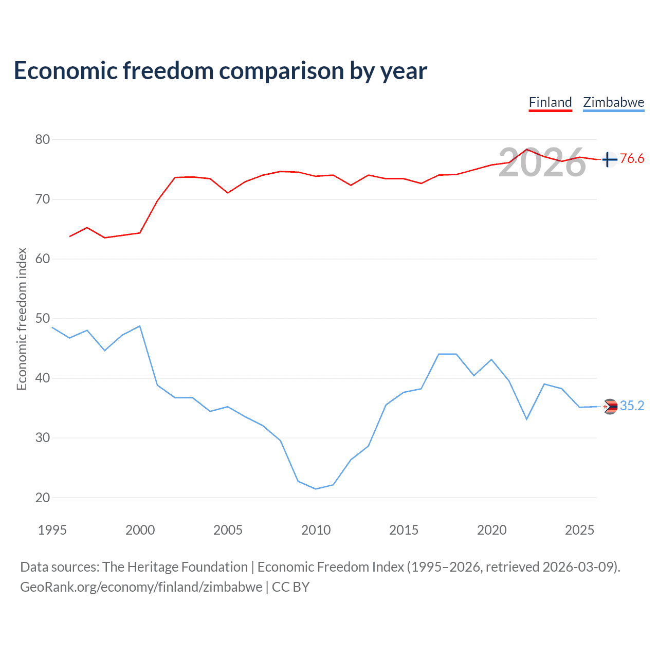 The Economic Freedom Index for Finland is 76.6, ranking 15/197, compared to 35.2 for Zimbabwe, ranking 190/197. The chart above displays a comparison of annual changes in economic freedom indexes.