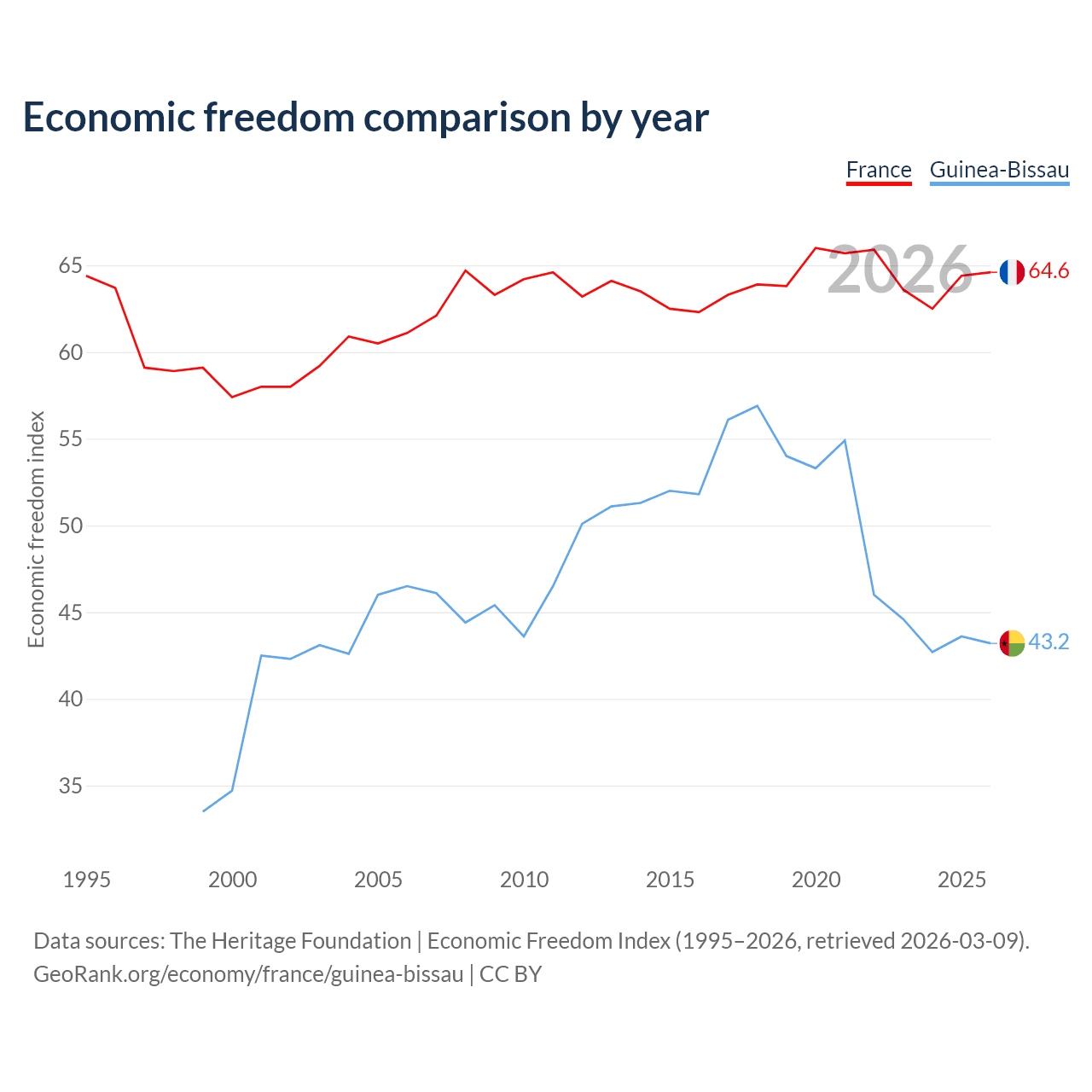 The Economic Freedom Index for France is 64.6, ranking 72/197, compared to 43.2 for Guinea-Bissau, ranking 181/197. The chart above displays a comparison of annual changes in economic freedom indexes.