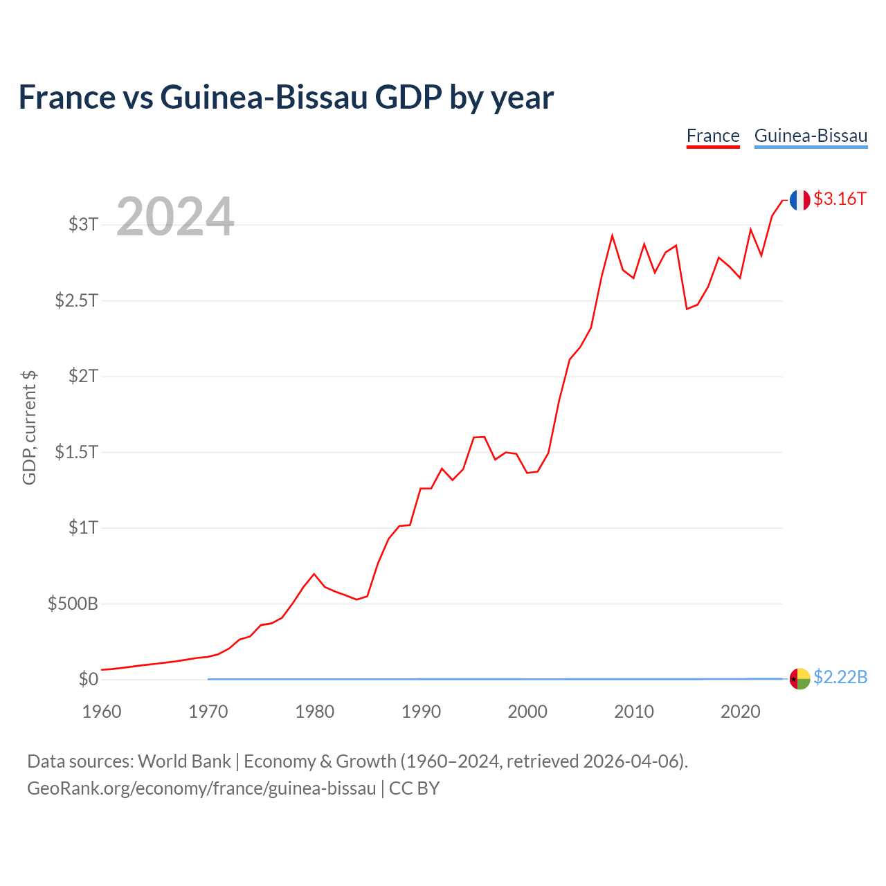 France has a GDP of $3.16T compared to $2.22B for Guinea-Bissau, ranking 7/197 and 176/197 by economy size, respectively.