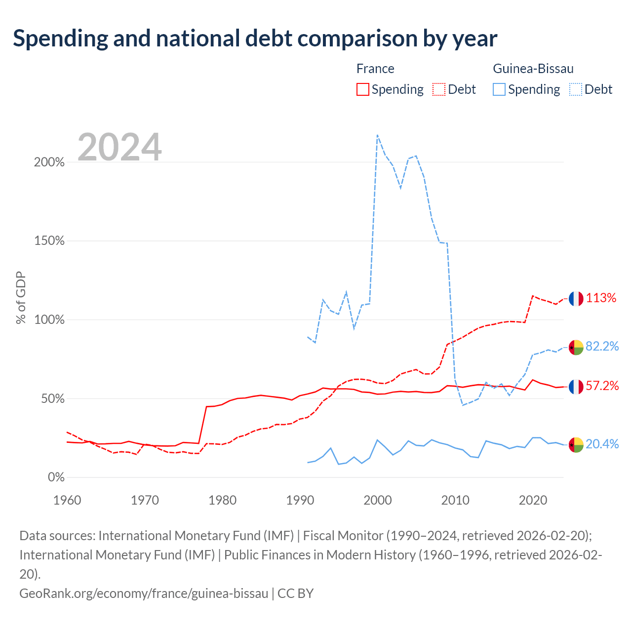 France has $3.58T in government debt (113.1% of GDP), compared to $1.82B (82.2% of GDP) in Guinea-Bissau.