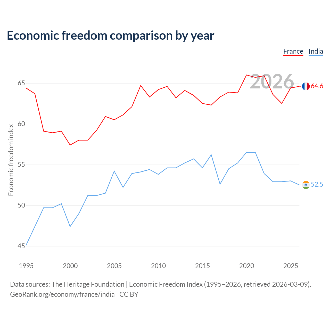The Economic Freedom Index for France is 64.6, ranking 72/197, compared to 52.5 for India, ranking 146/197. The chart above displays a comparison of annual changes in economic freedom indexes.