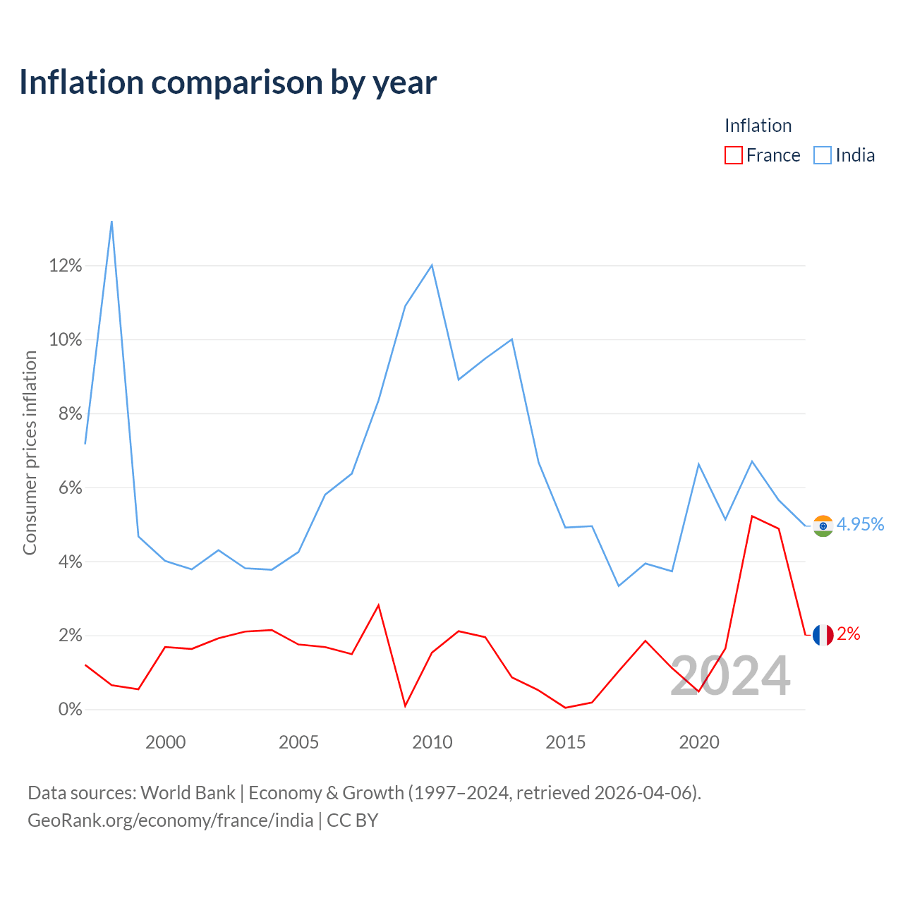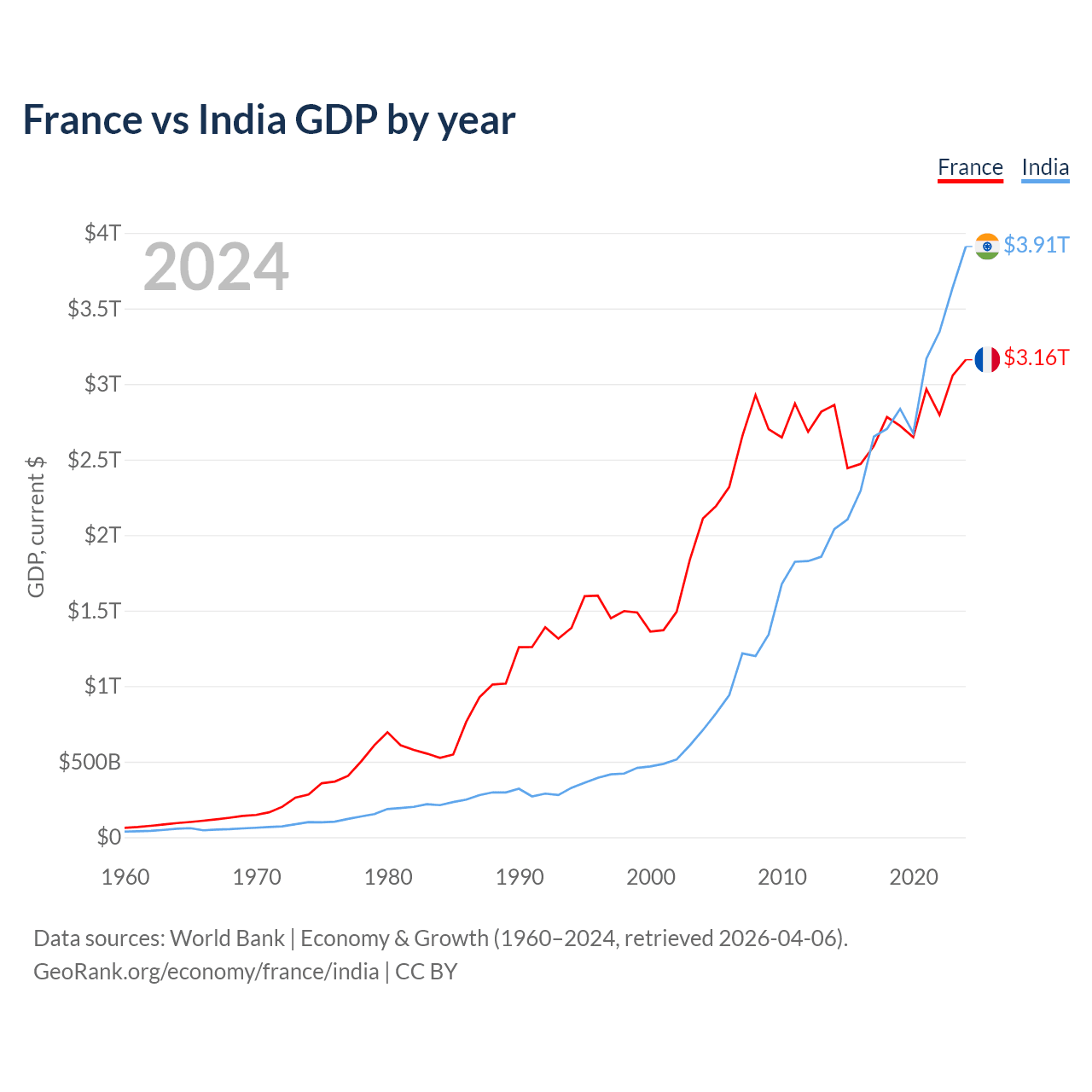 France has a GDP of $3.16T compared to $3.91T for India, ranking 7/197 and 5/197 by economy size, respectively.