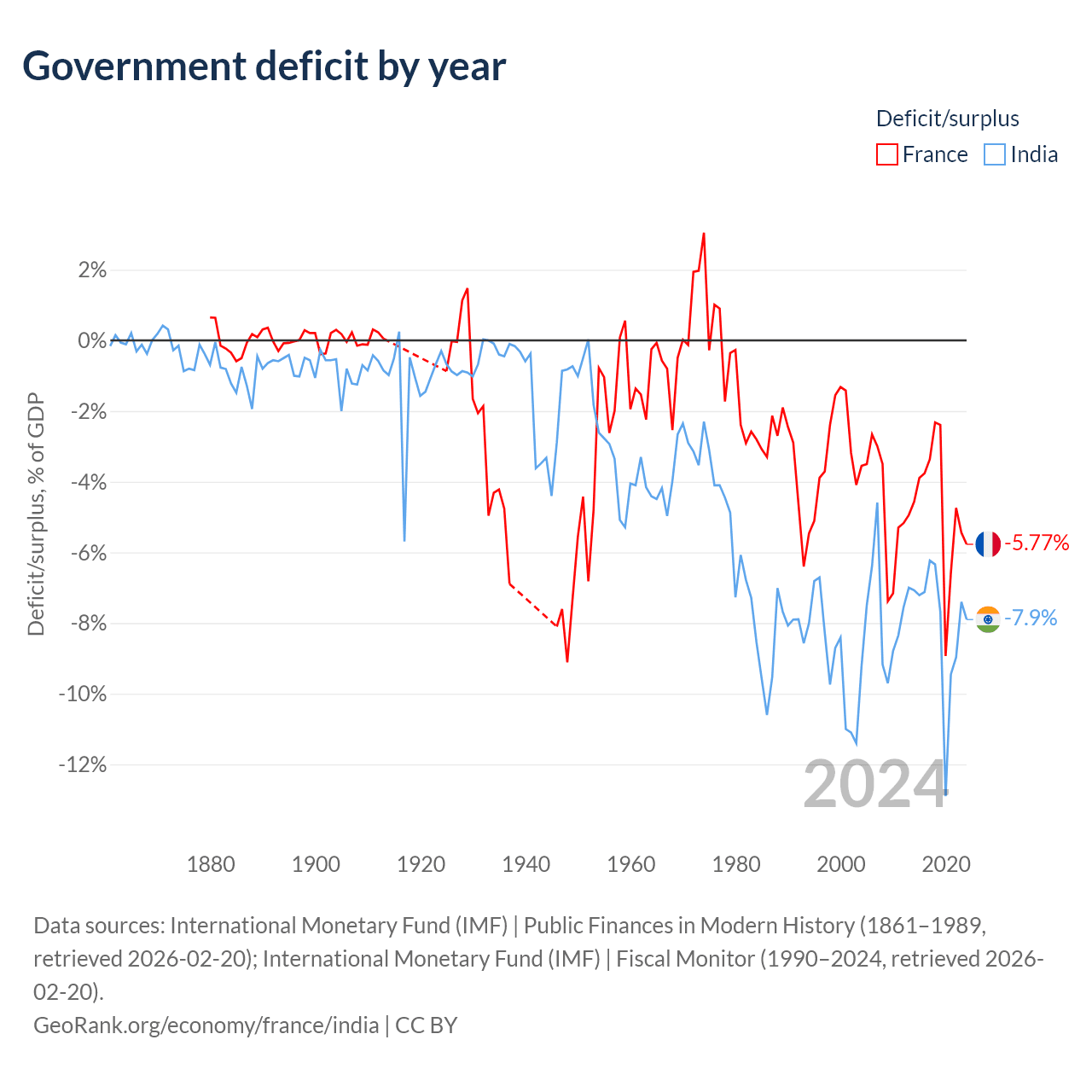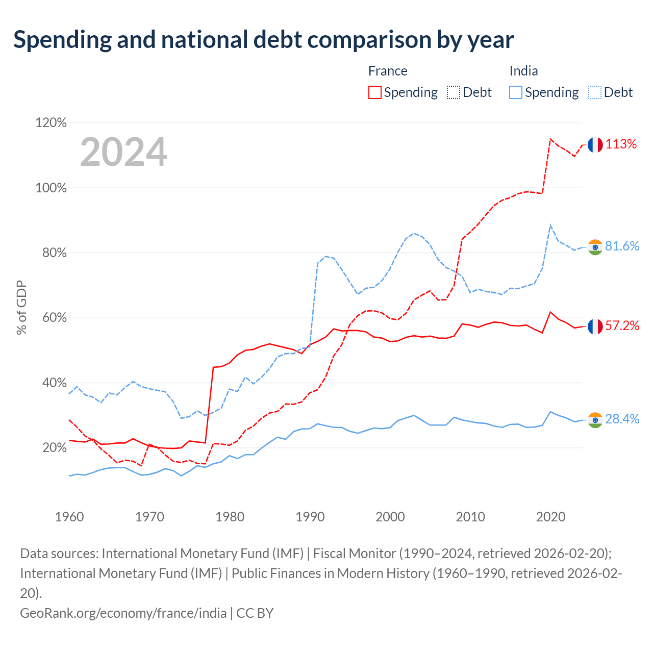 France has $3.58T in government debt (113.1% of GDP), compared to $3.19T (81.6% of GDP) in India.