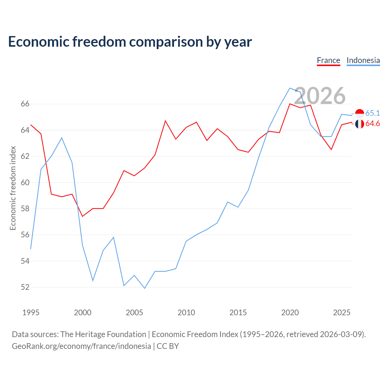 The Economic Freedom Index for France is 64.6, ranking 72/197, compared to 65.1 for Indonesia, ranking 67/197. The chart above displays a comparison of annual changes in economic freedom indexes.