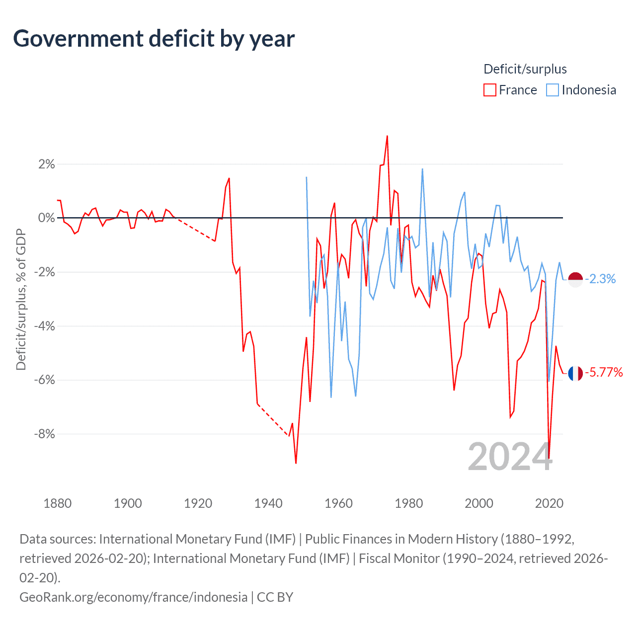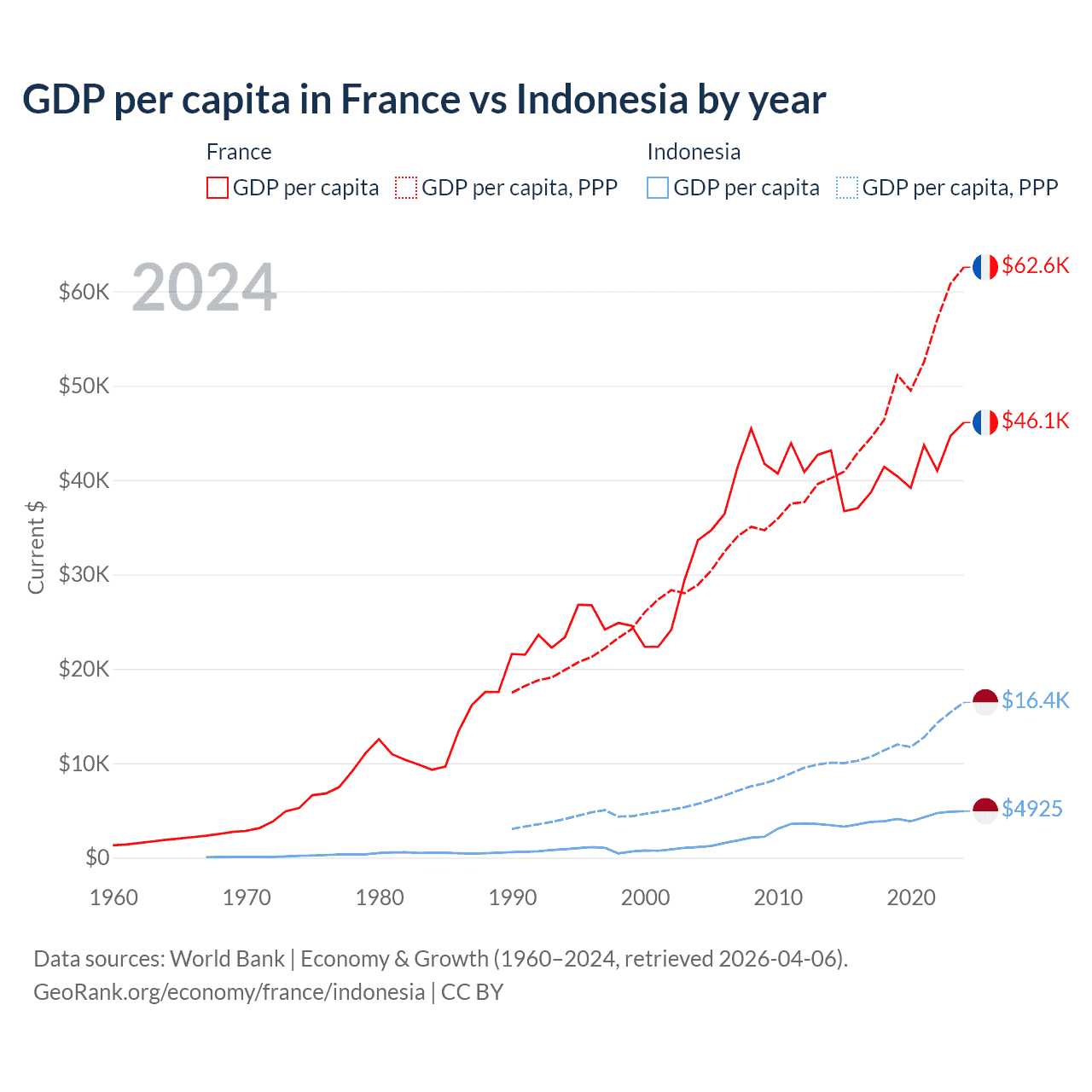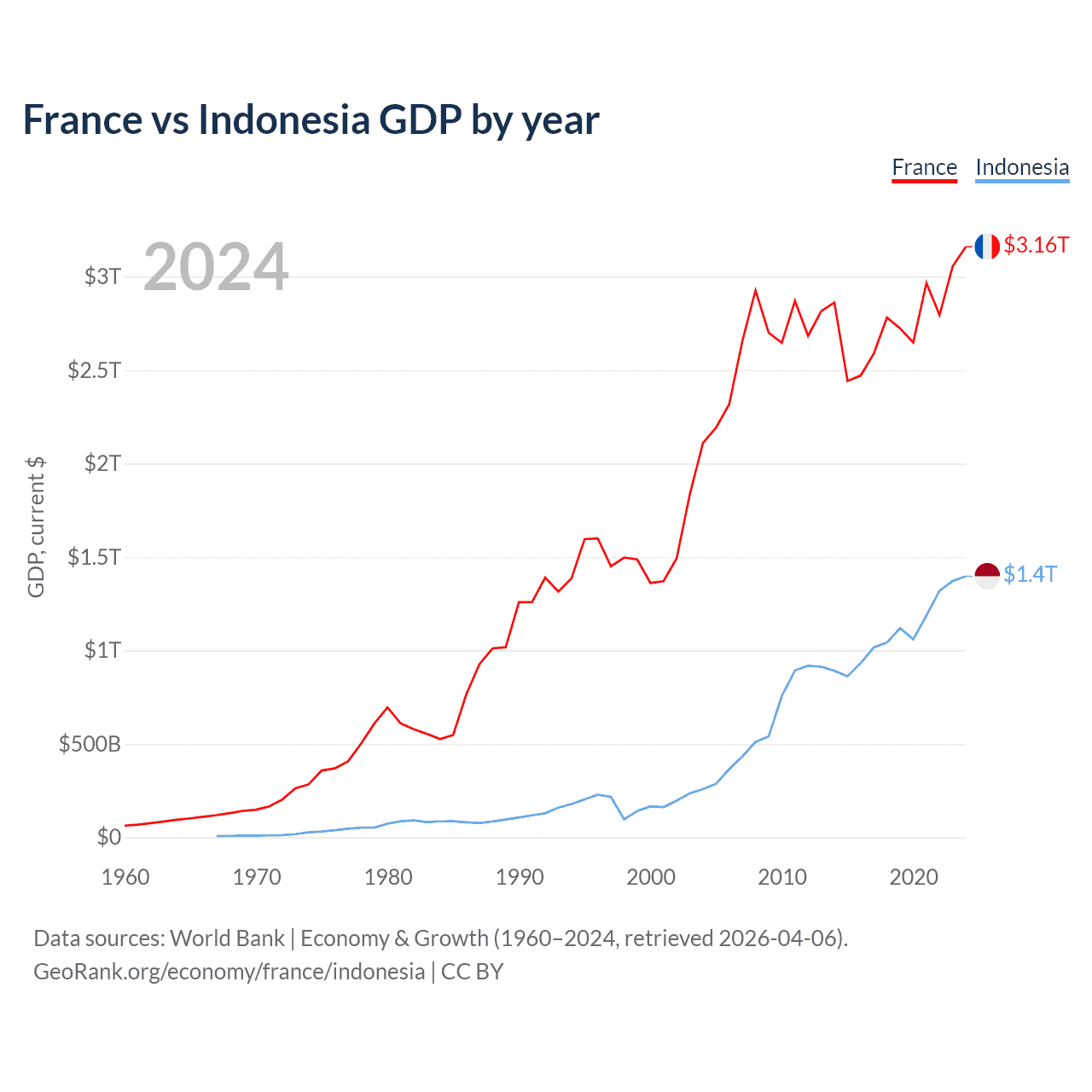 France has a GDP of $3.16T compared to $1.4T for Indonesia, ranking 7/197 and 16/197 by economy size, respectively.