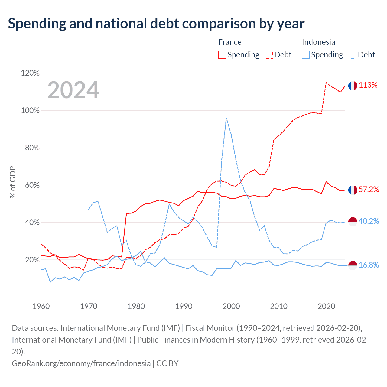 France has $3.58T in government debt (113.1% of GDP), compared to $561B (40.2% of GDP) in Indonesia.