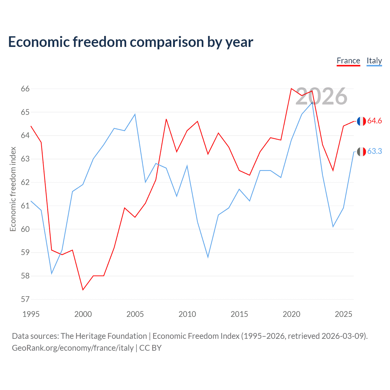 The Economic Freedom Index for France is 64.6, ranking 72/197, compared to 63.3 for Italy, ranking 80/197. The chart above displays a comparison of annual changes in economic freedom indexes.