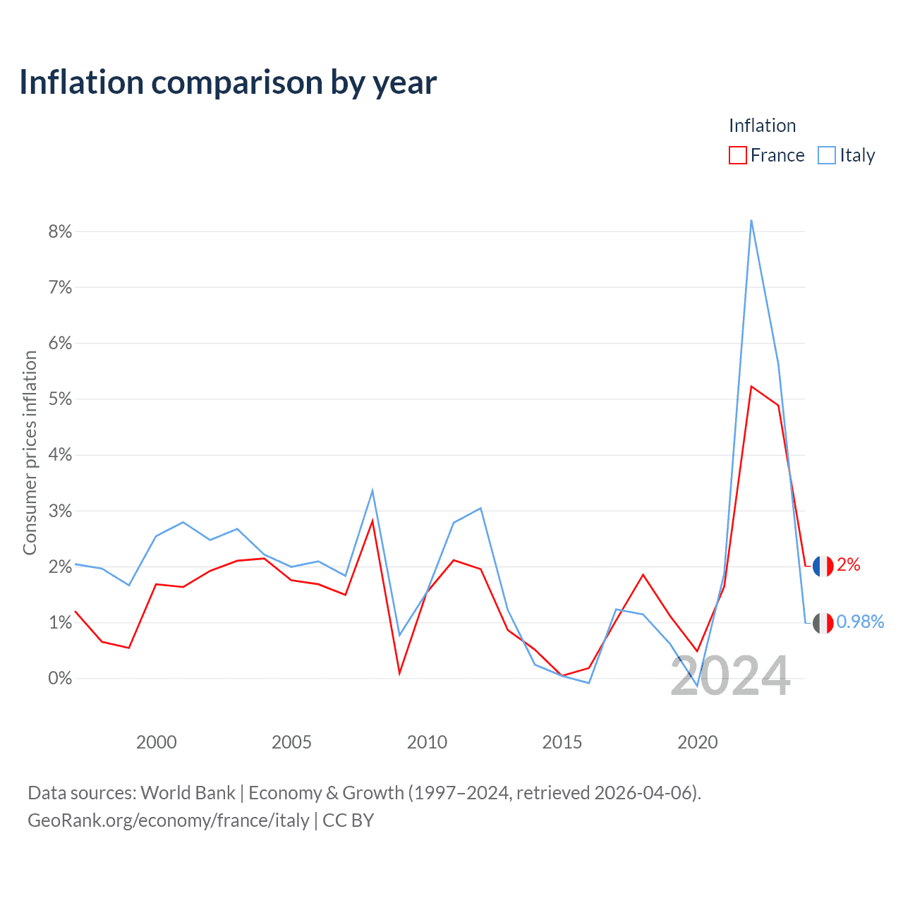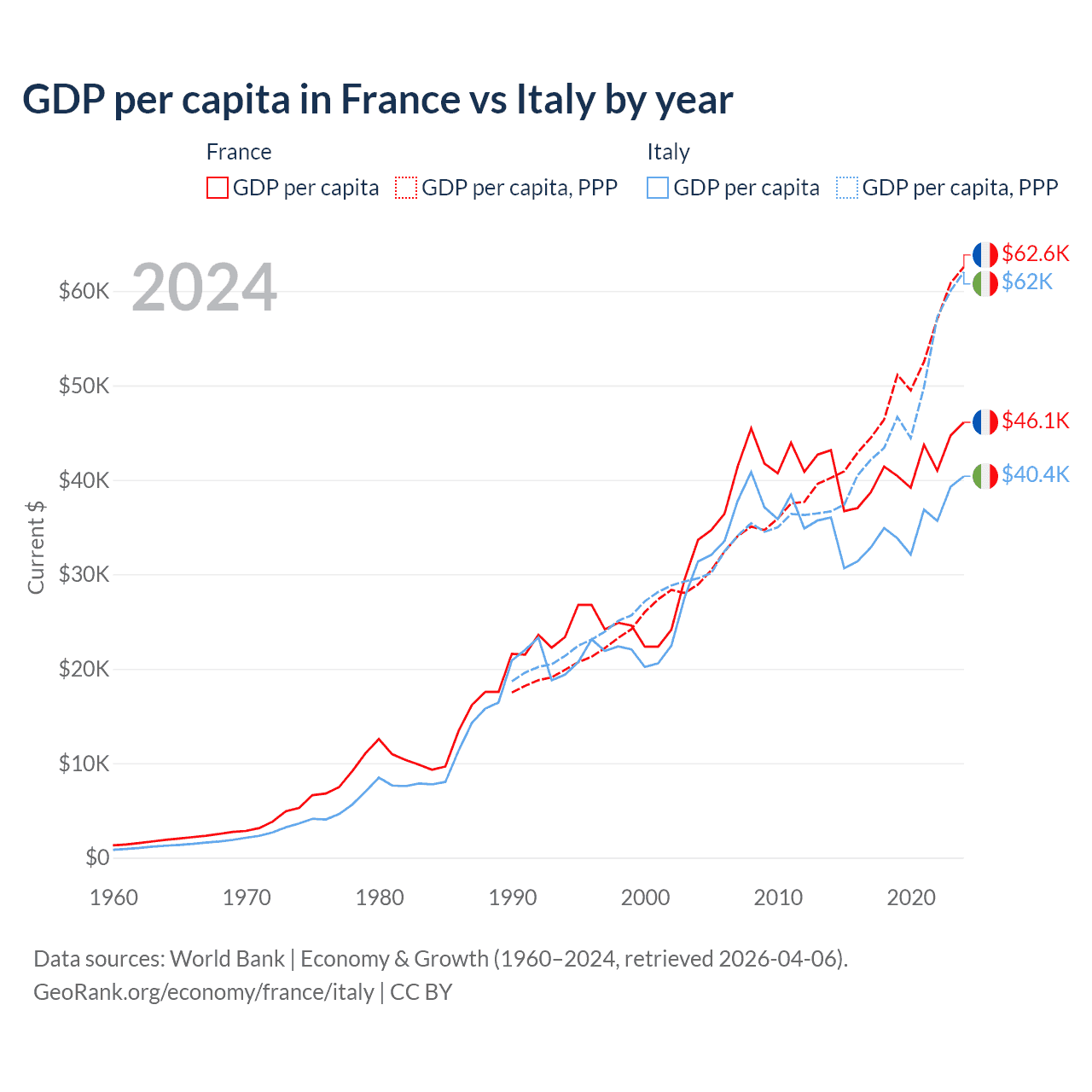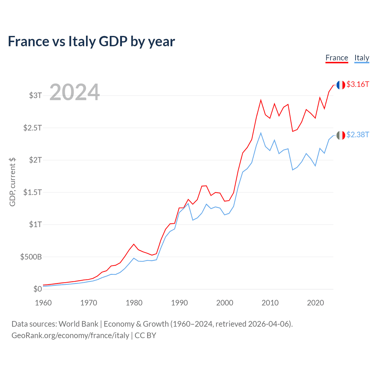 France has a GDP of $3.16T compared to $2.38T for Italy, ranking 7/197 and 8/197 by economy size, respectively.