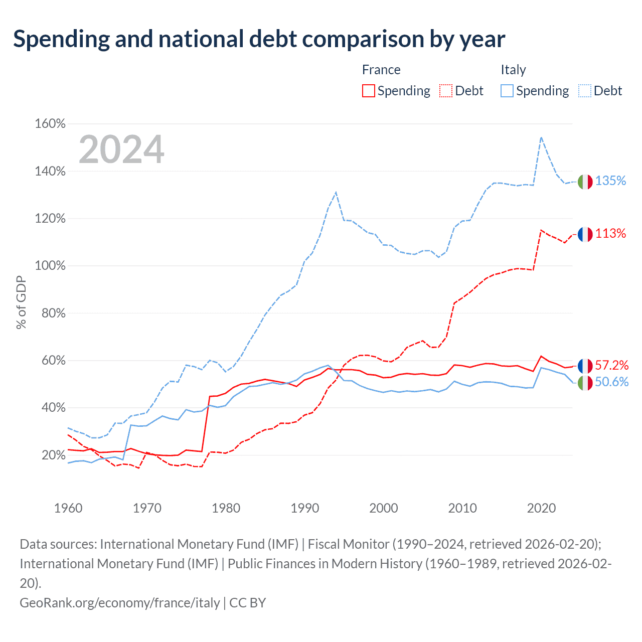 France has $3.58T in government debt (113.1% of GDP), compared to $3.22T (135.3% of GDP) in Italy.