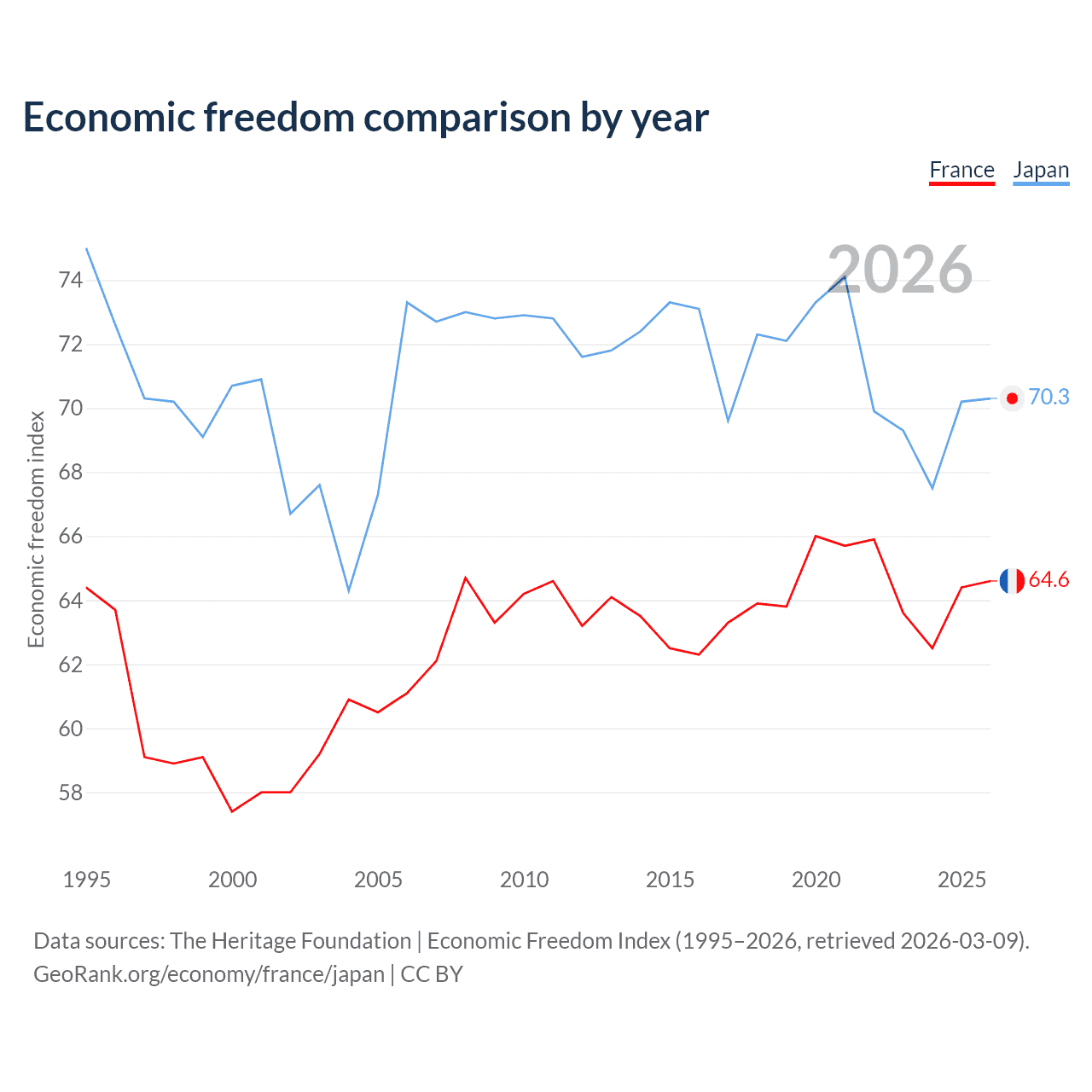 The Economic Freedom Index for France is 64.6, ranking 72/197, compared to 70.3 for Japan, ranking 36/197. The chart above displays a comparison of annual changes in economic freedom indexes.