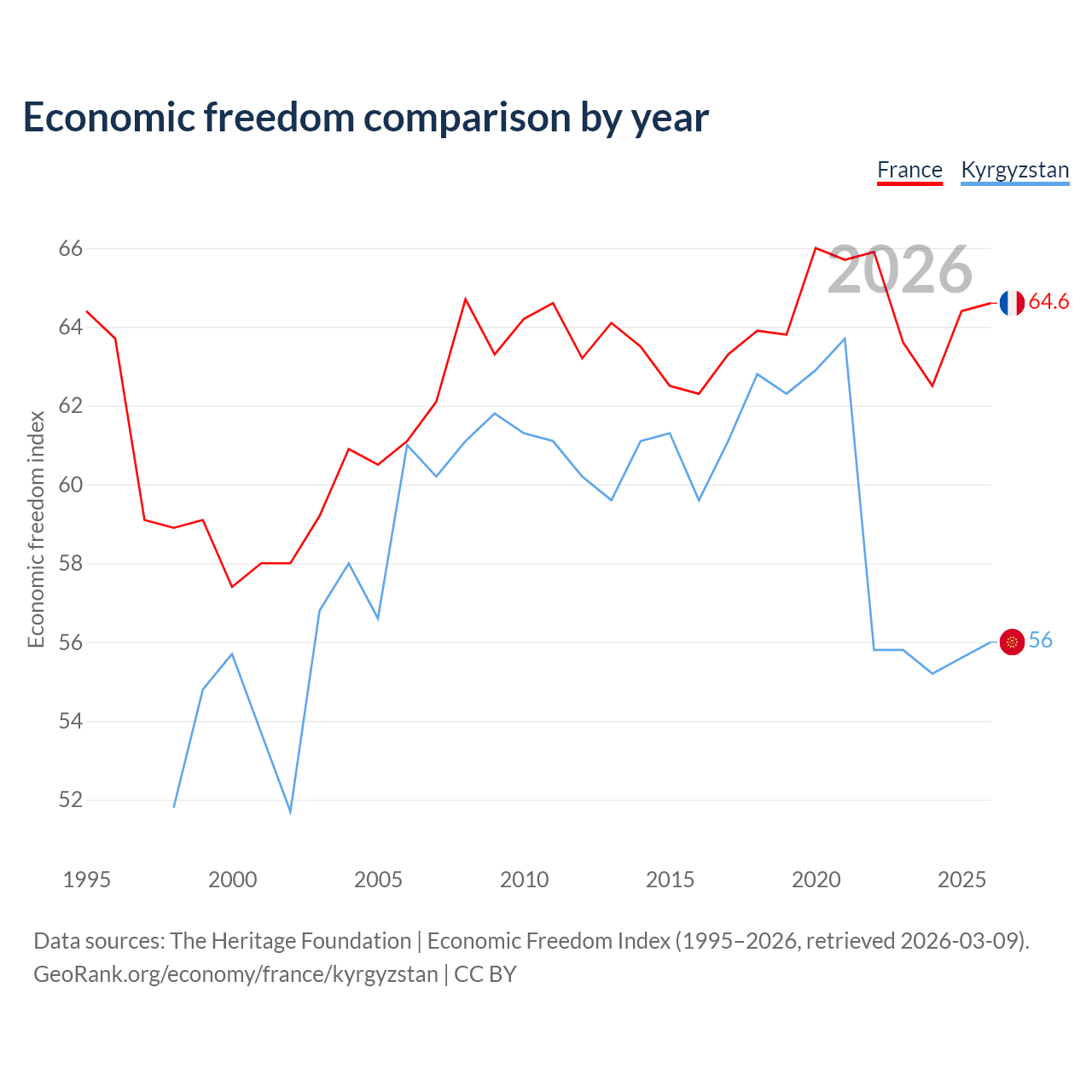 The Economic Freedom Index for France is 64.6, ranking 72/197, compared to 56 for Kyrgyzstan, ranking 126/197. The chart above displays a comparison of annual changes in economic freedom indexes.