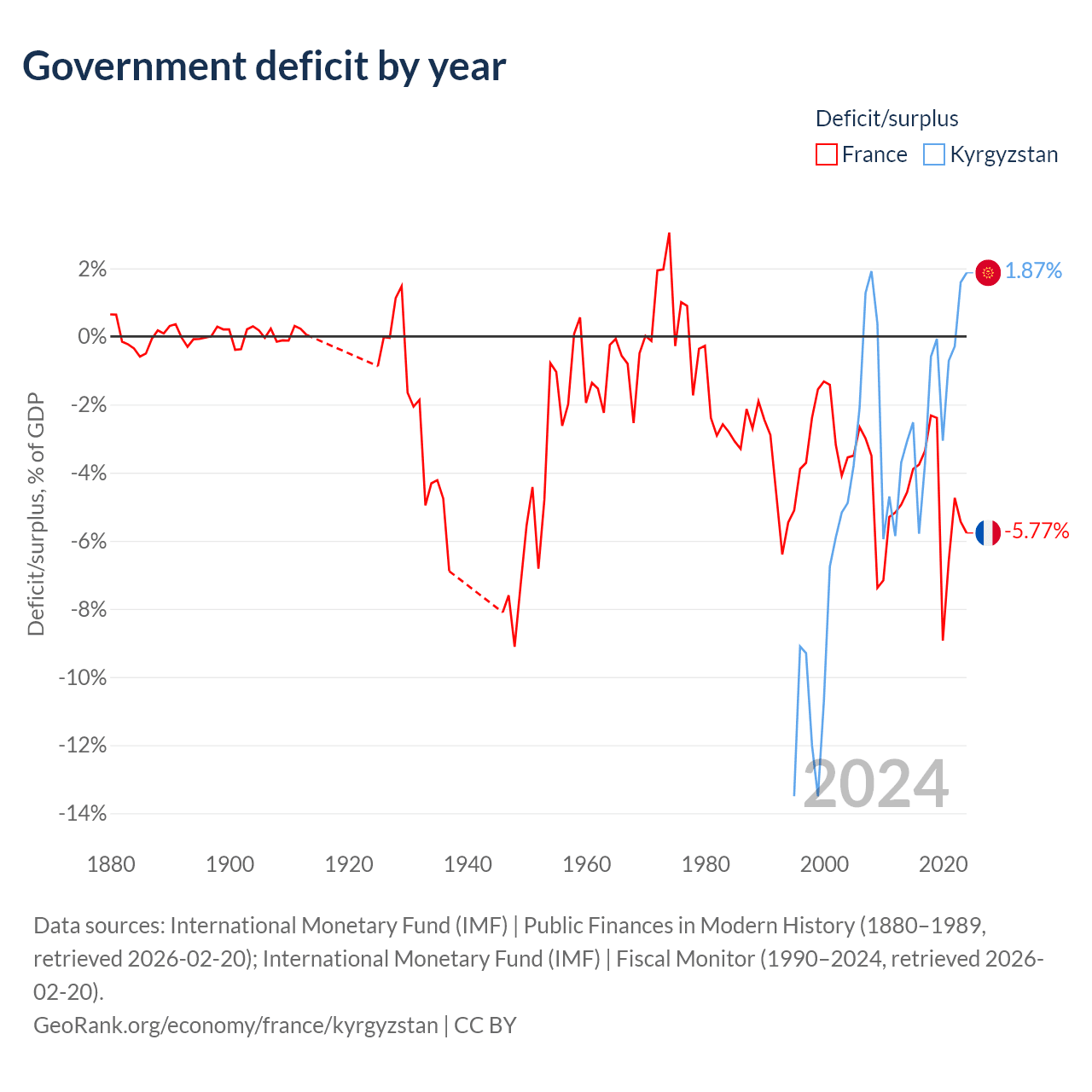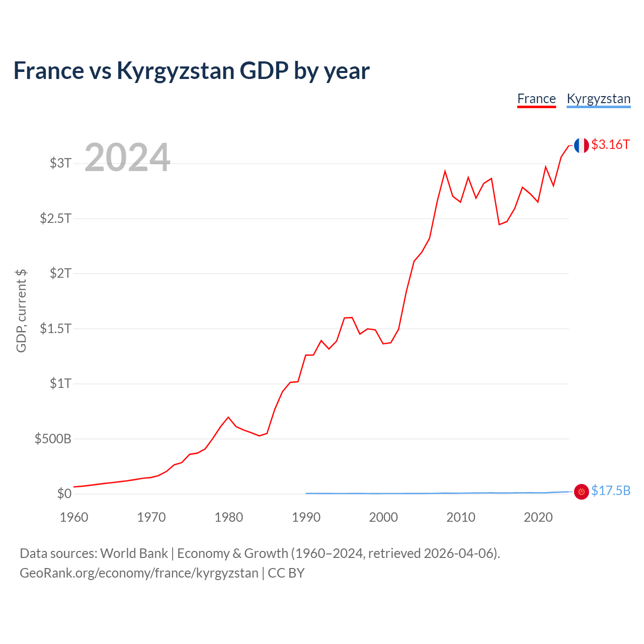 France has a GDP of $3.16T compared to $17.5B for Kyrgyzstan, ranking 7/197 and 135/197 by economy size, respectively.