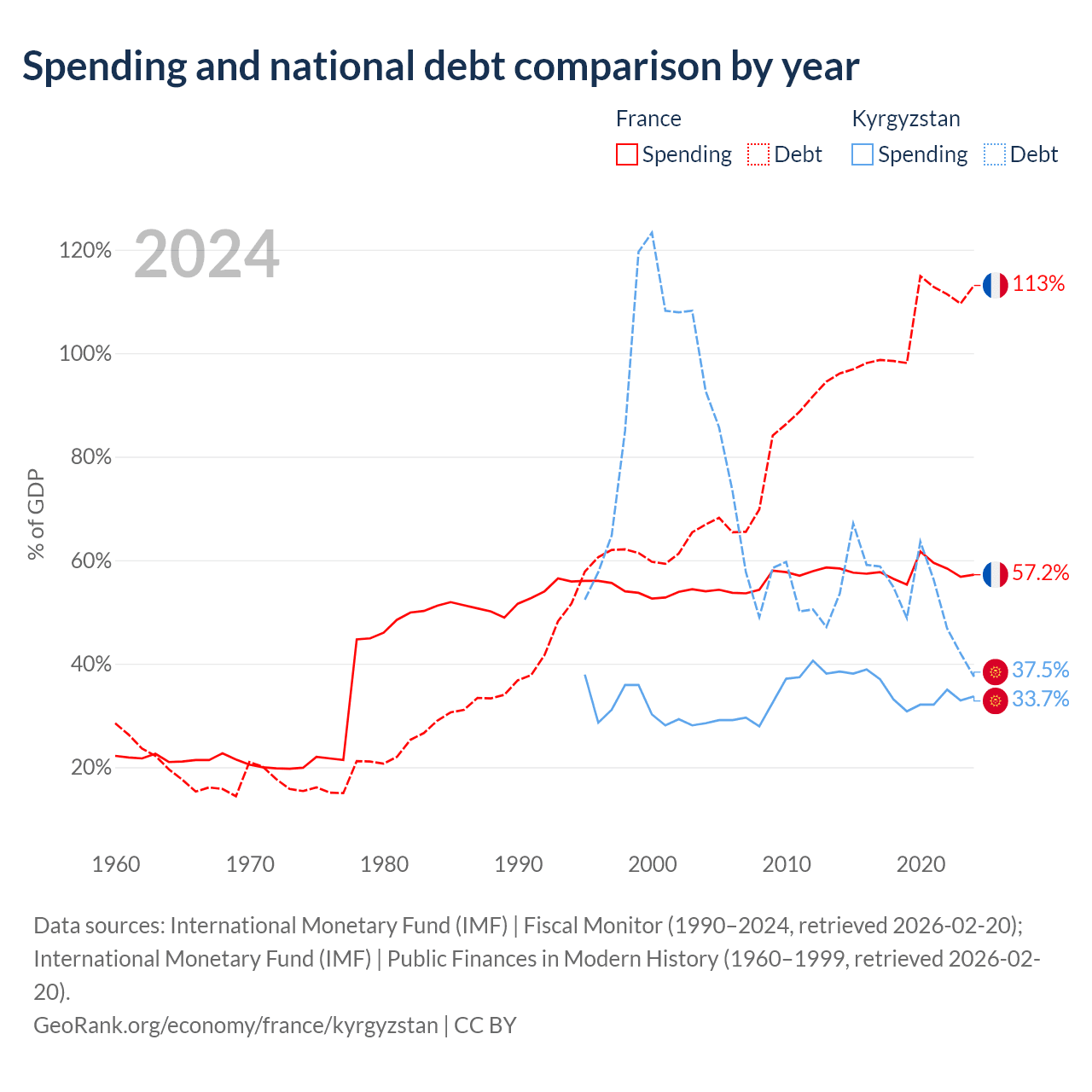 France has $3.58T in government debt (113.1% of GDP), compared to $6.56B (37.5% of GDP) in Kyrgyzstan.