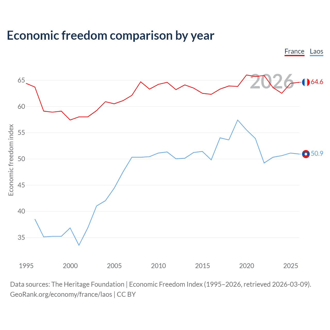 The Economic Freedom Index for France is 64.6, ranking 72/197, compared to 50.9 for Laos, ranking 157/197. The chart above displays a comparison of annual changes in economic freedom indexes.