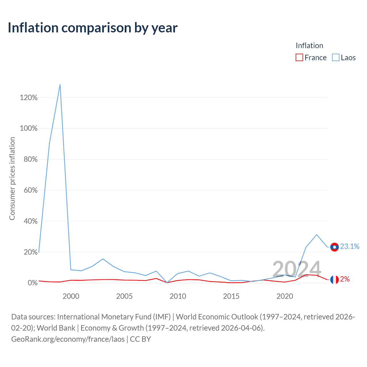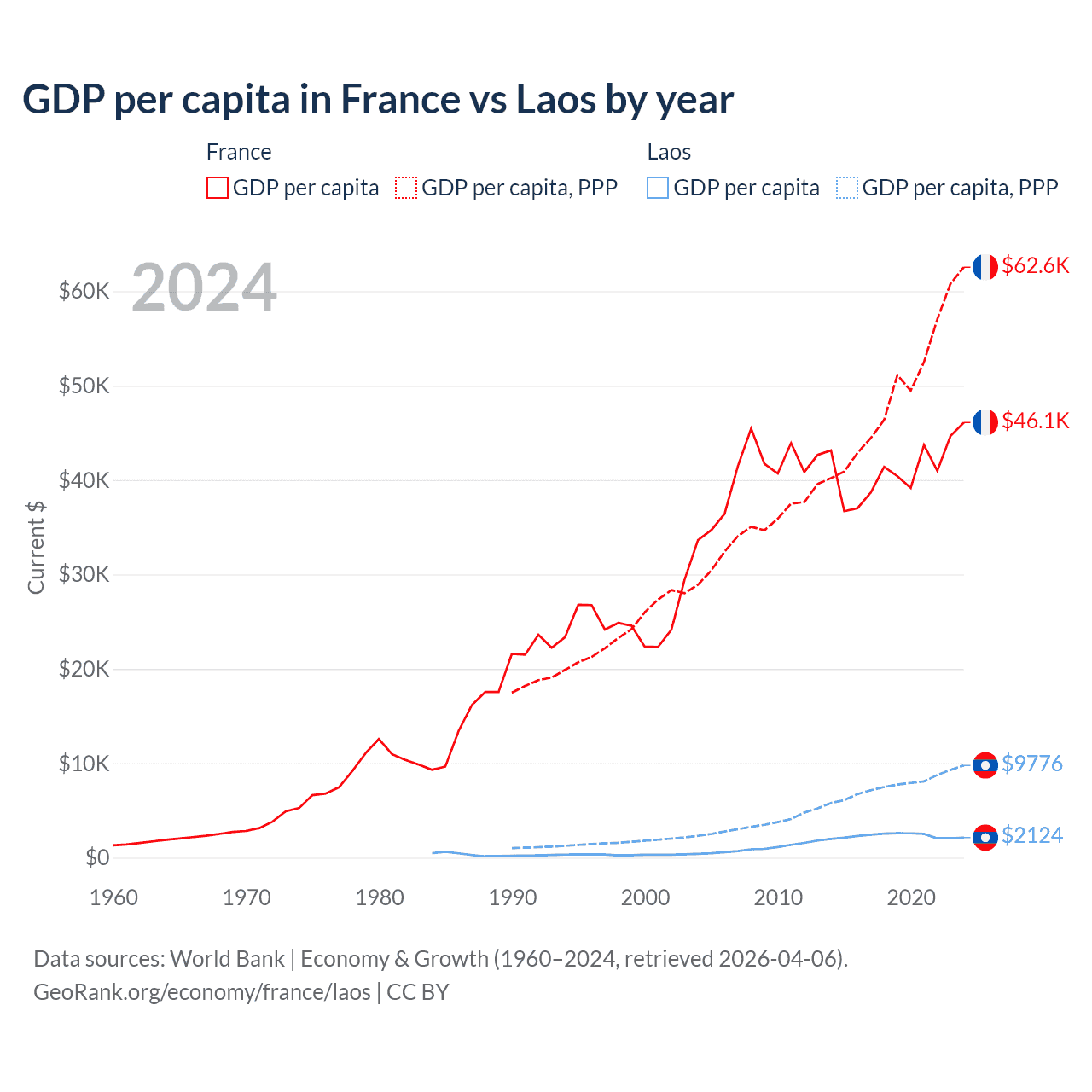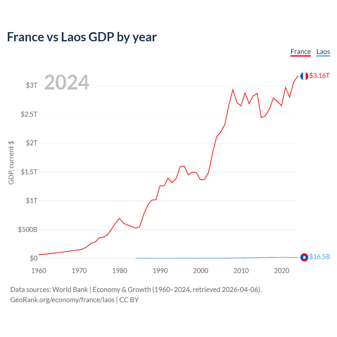 France has a GDP of $3.16T compared to $16.5B for Laos, ranking 7/197 and 139/197 by economy size, respectively.
