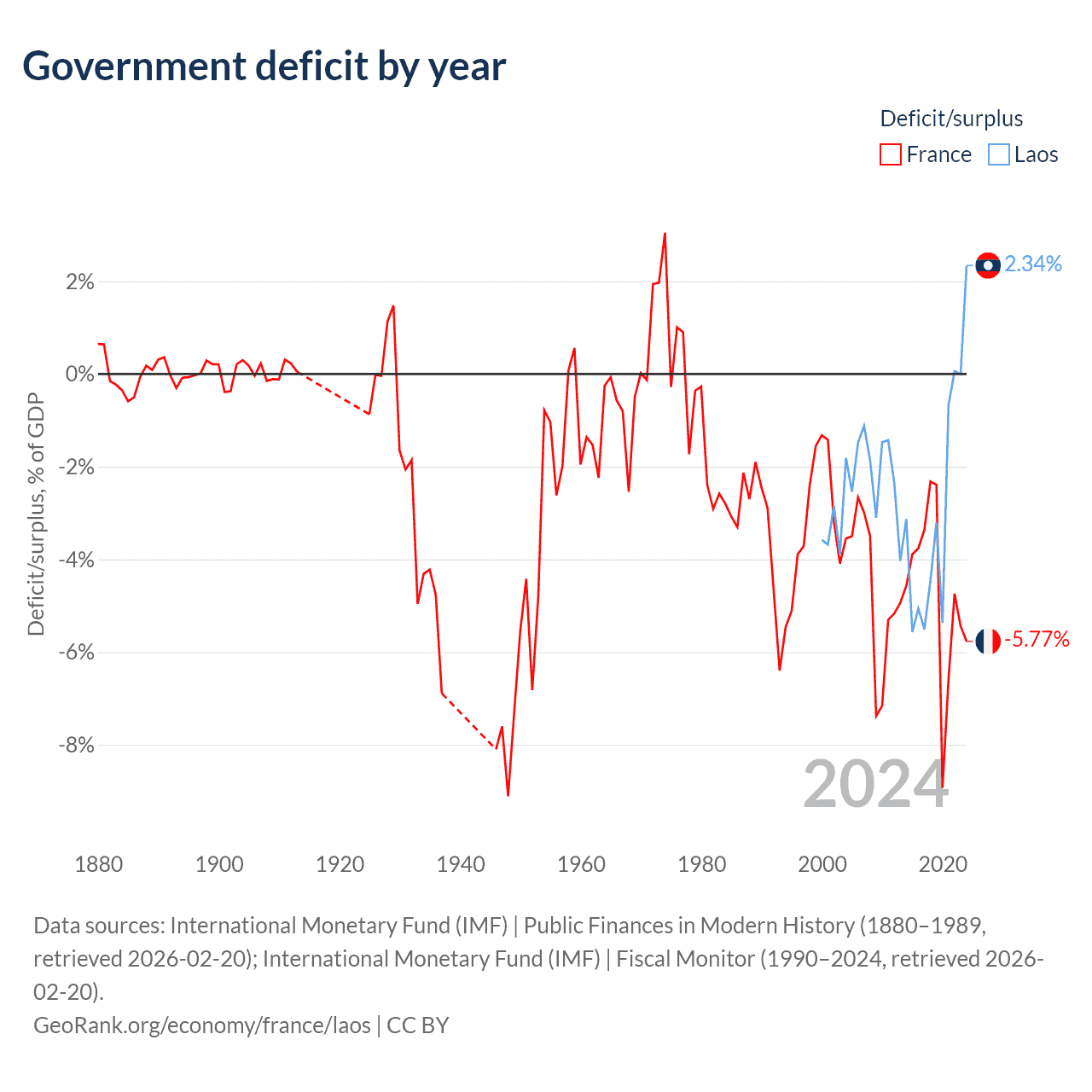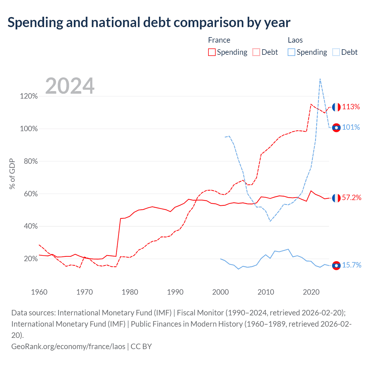 France has $3.58T in government debt (113.1% of GDP), compared to $16.6B (100.5% of GDP) in Laos.