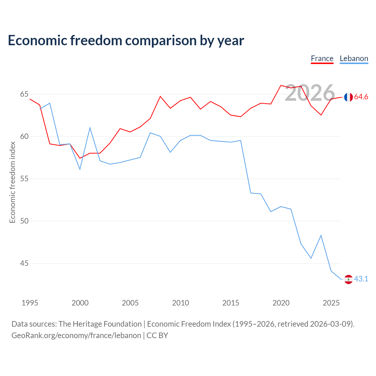 The Economic Freedom Index for France is 64.6, ranking 72/197, compared to 43.1 for Lebanon, ranking 183/197. The chart above displays a comparison of annual changes in economic freedom indexes.
