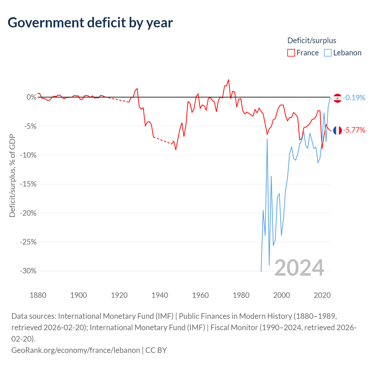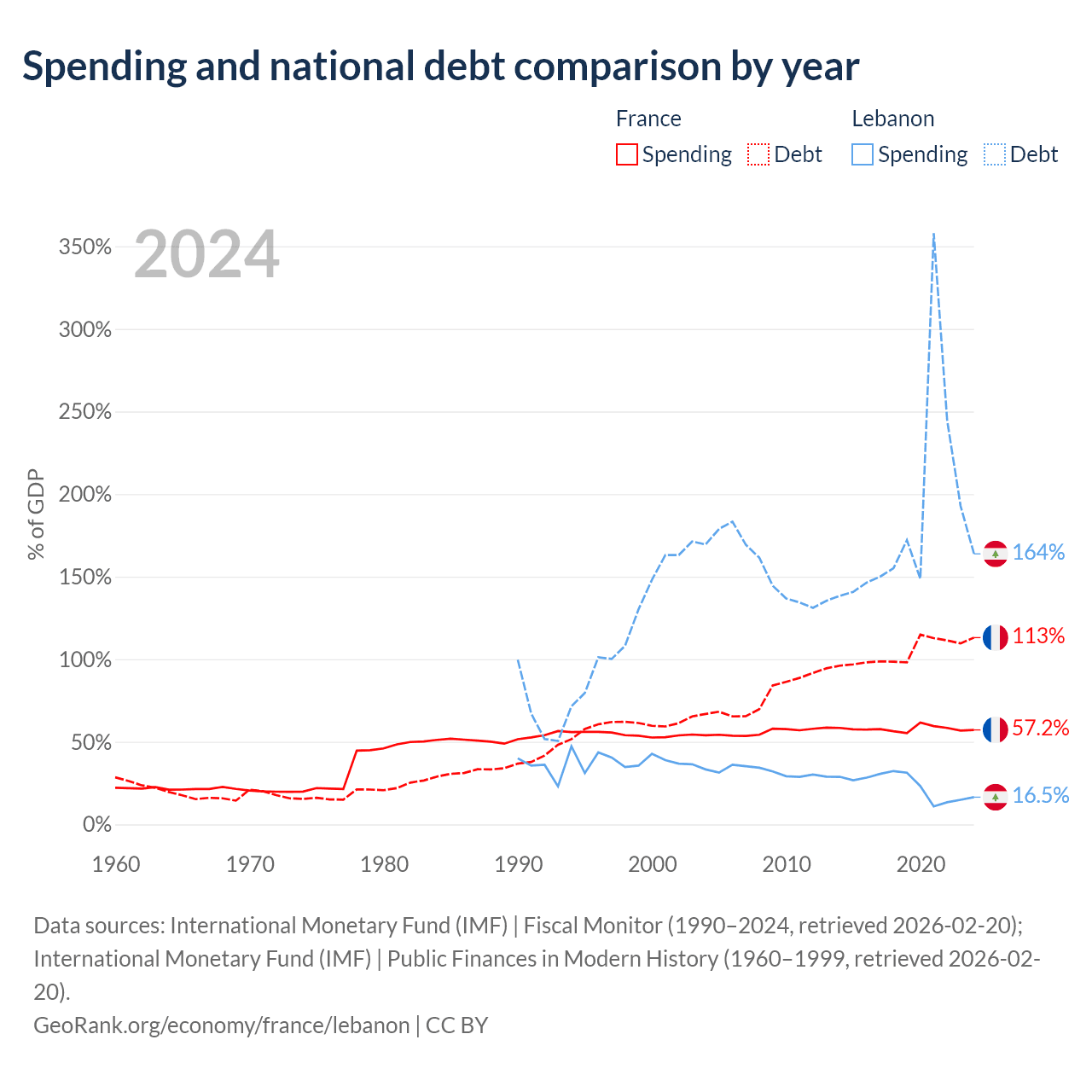 France has $3.58T in government debt (113.1% of GDP), compared to $38.7B (163.8% of GDP) in Lebanon.