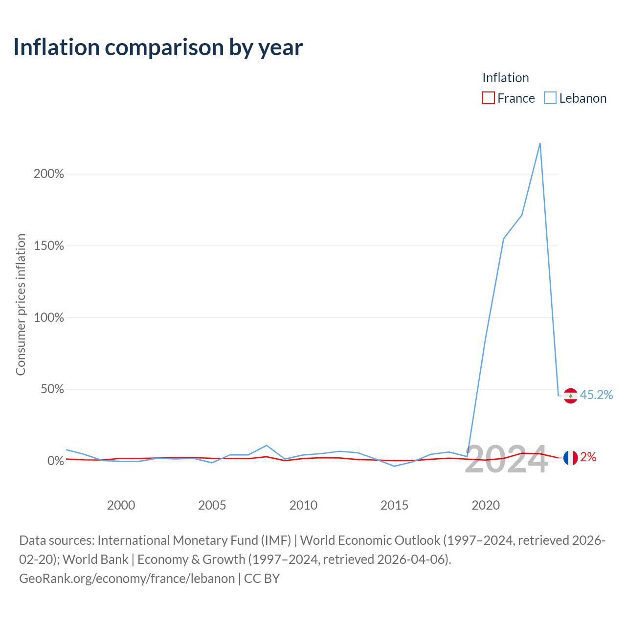 France has a GDP of $3.16T compared to $20.1B for Lebanon, ranking 7/197 and 128/197 by economy size, respectively.