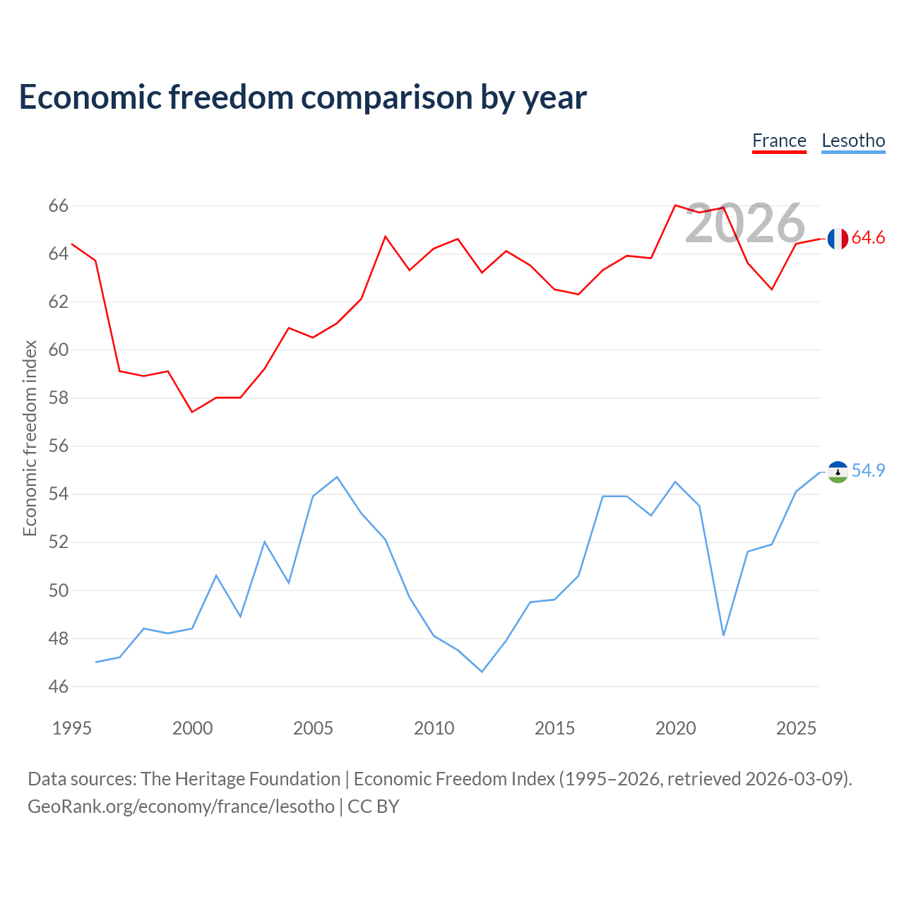 The Economic Freedom Index for France is 64.6, ranking 72/197, compared to 54.9 for Lesotho, ranking 130/197. The chart above displays a comparison of annual changes in economic freedom indexes.