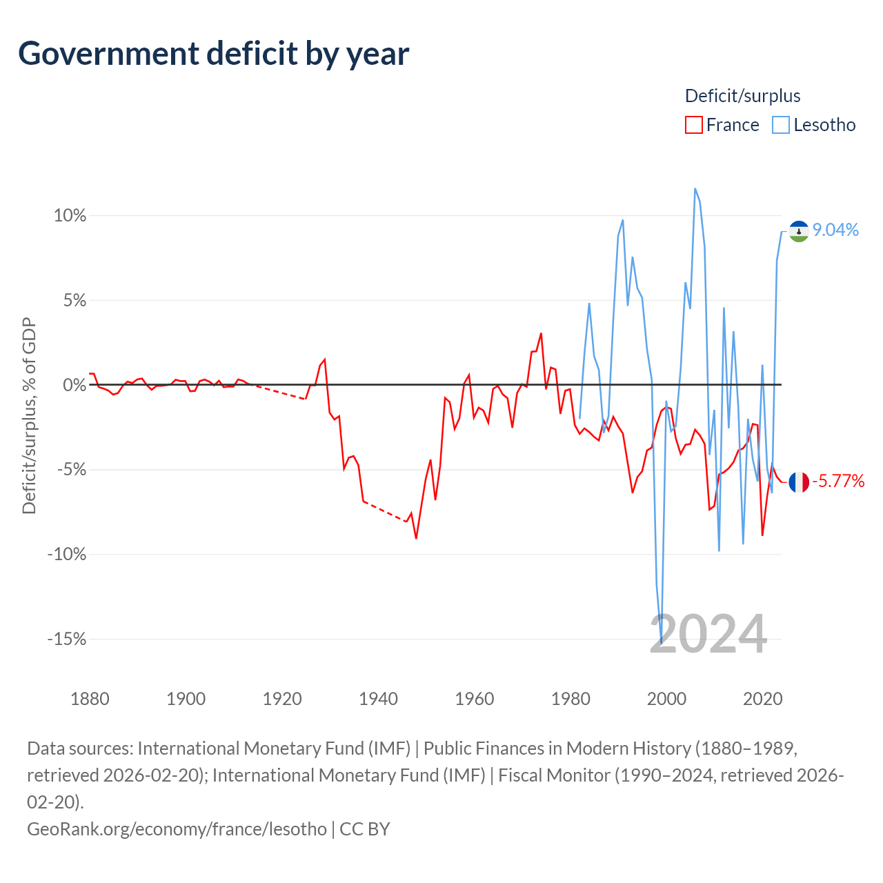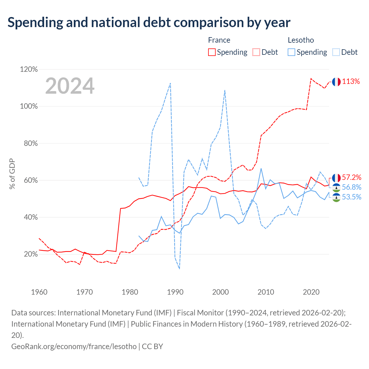 France has $3.58T in government debt (113.1% of GDP), compared to $1.29B (56.8% of GDP) in Lesotho.
