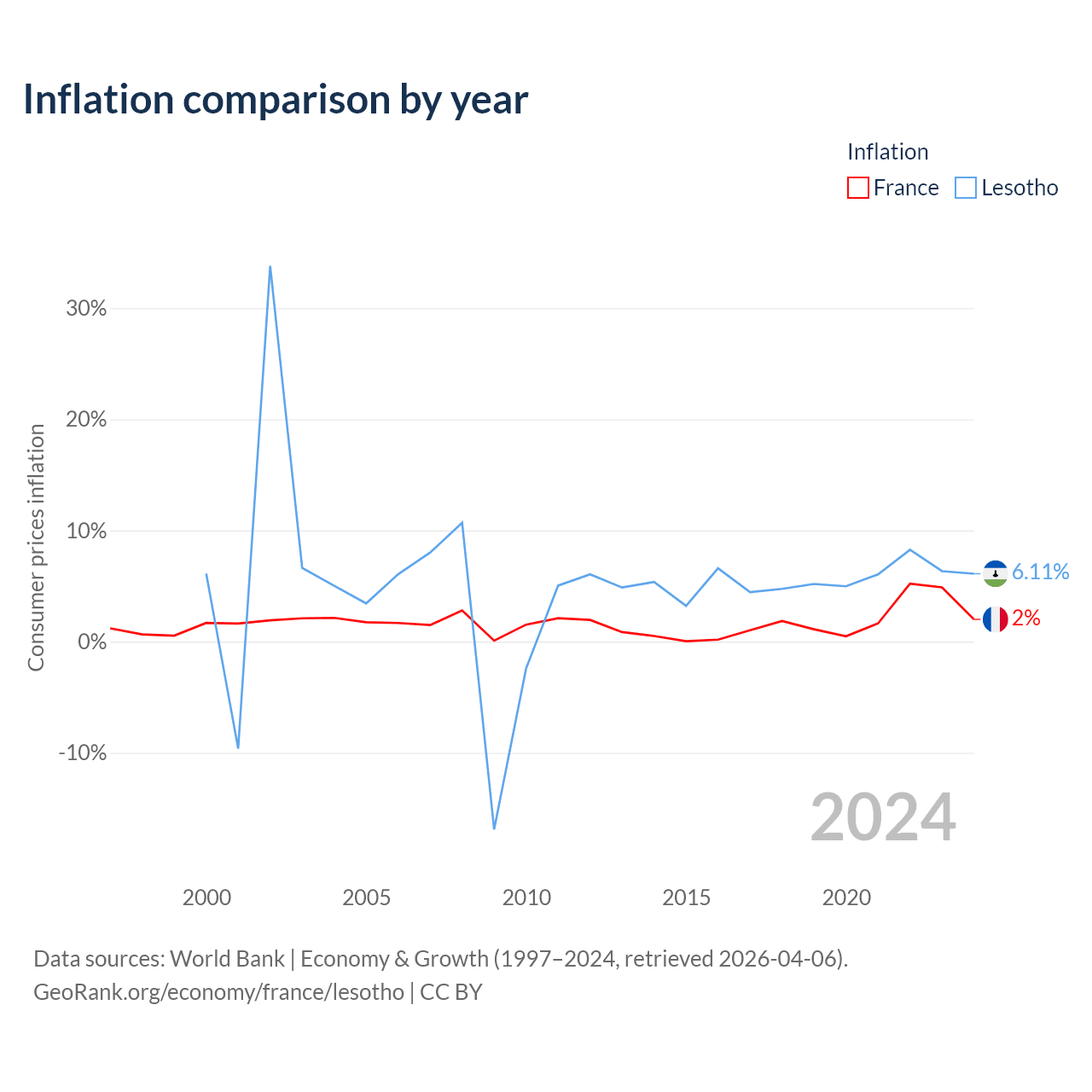 France has a GDP of $3.16T compared to $2.27B for Lesotho, ranking 7/197 and 175/197 by economy size, respectively.