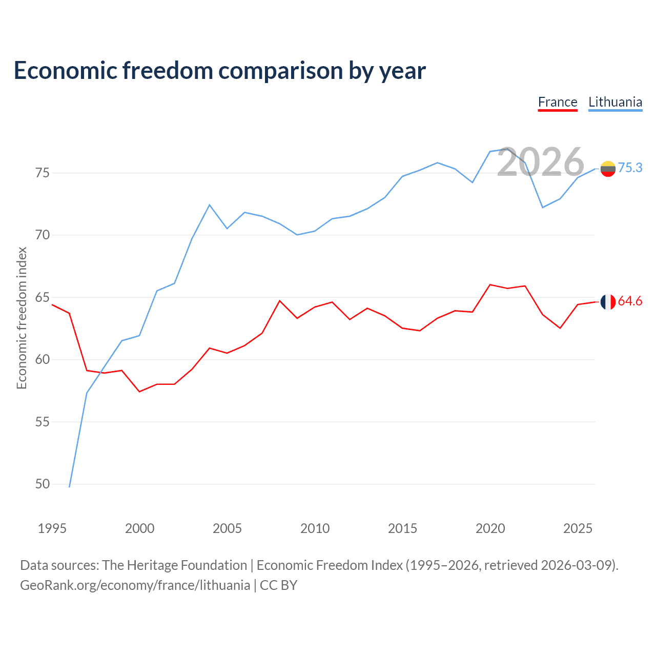 The Economic Freedom Index for France is 64.6, ranking 72/197, compared to 75.3 for Lithuania, ranking 18/197. The chart above displays a comparison of annual changes in economic freedom indexes.