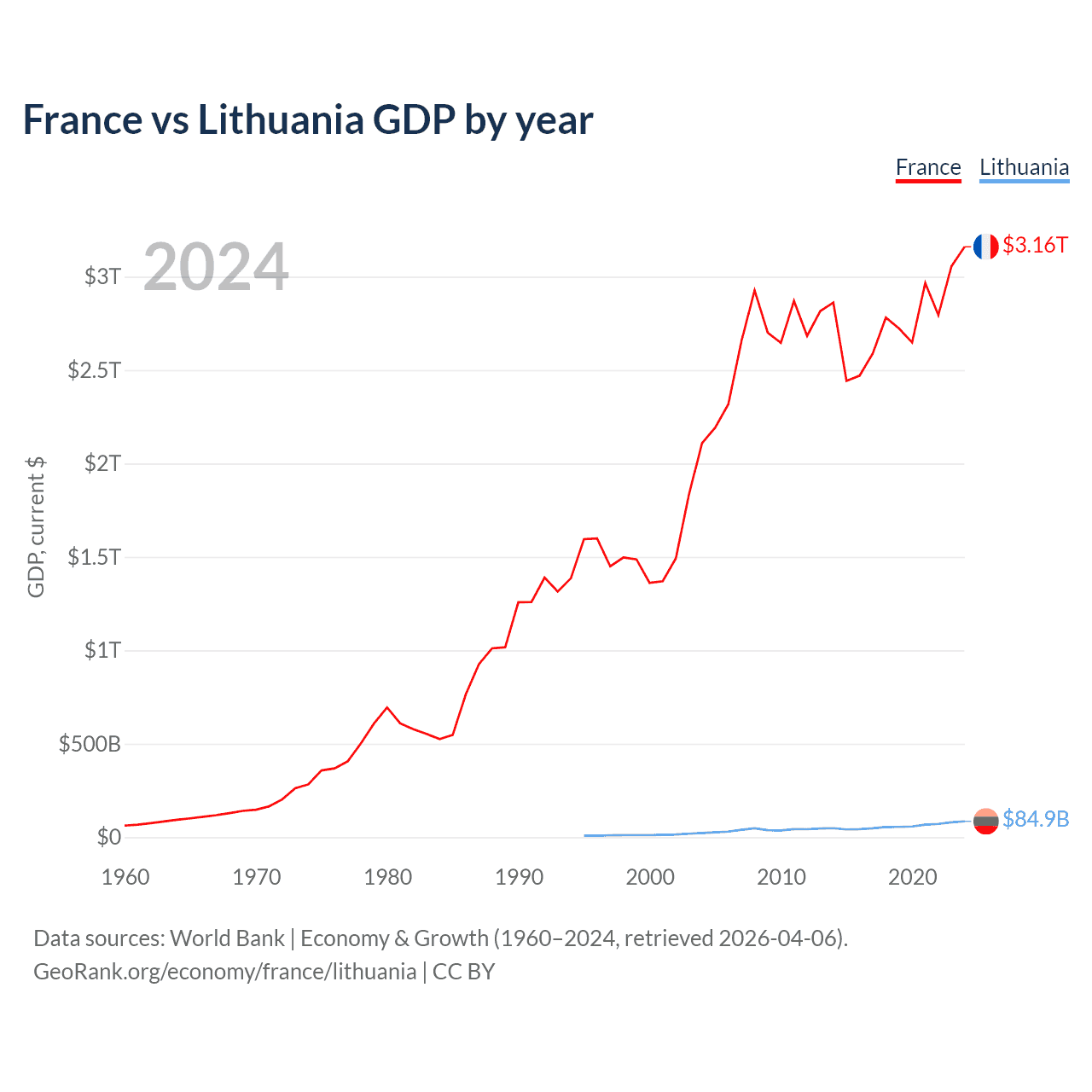 France has a GDP of $3.16T compared to $84.9B for Lithuania, ranking 7/197 and 79/197 by economy size, respectively.