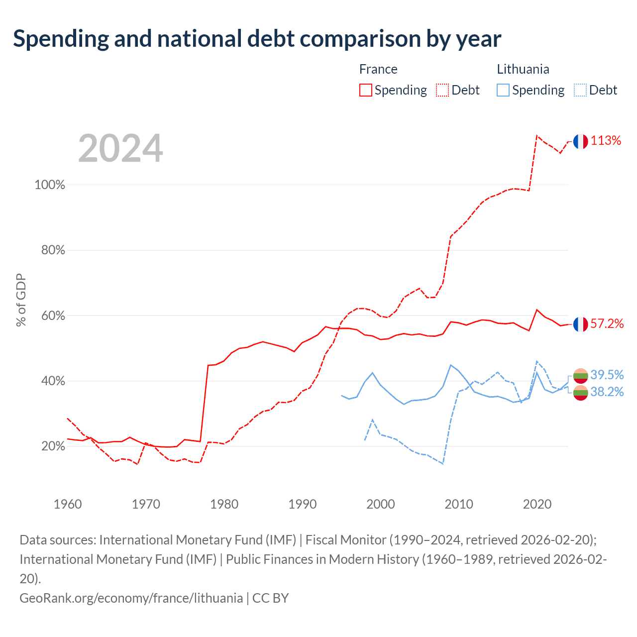 France has $3.58T in government debt (113.1% of GDP), compared to $32.4B (38.2% of GDP) in Lithuania.