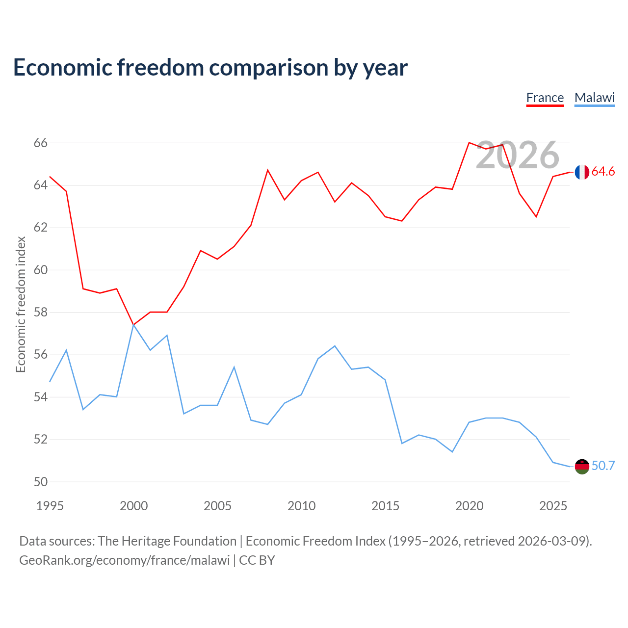The Economic Freedom Index for France is 64.6, ranking 72/197, compared to 50.7 for Malawi, ranking 159/197. The chart above displays a comparison of annual changes in economic freedom indexes.