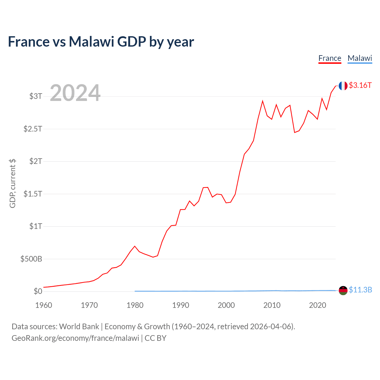 France has a GDP of $3.16T compared to $11.3B for Malawi, ranking 7/197 and 151/197 by economy size, respectively.