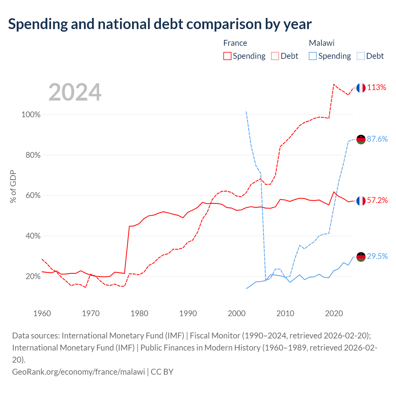 France has $3.58T in government debt (113.1% of GDP), compared to $9.91B (87.6% of GDP) in Malawi.