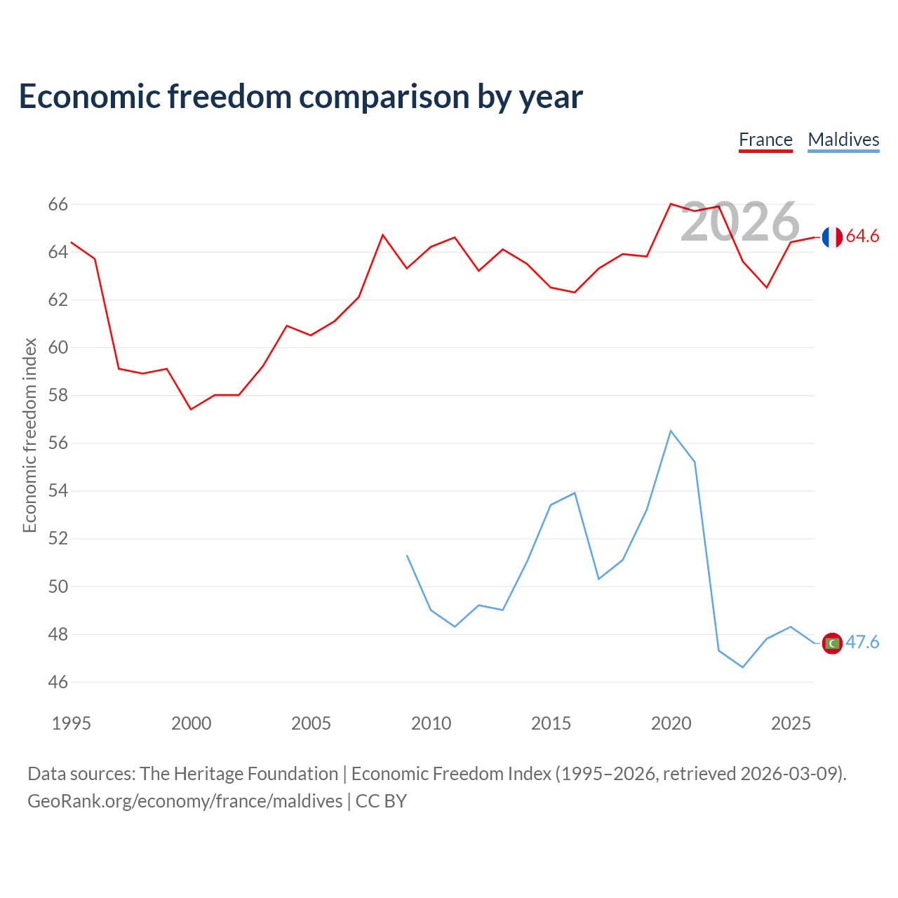 The Economic Freedom Index for France is 64.6, ranking 72/197, compared to 47.6 for Maldives, ranking 174/197. The chart above displays a comparison of annual changes in economic freedom indexes.