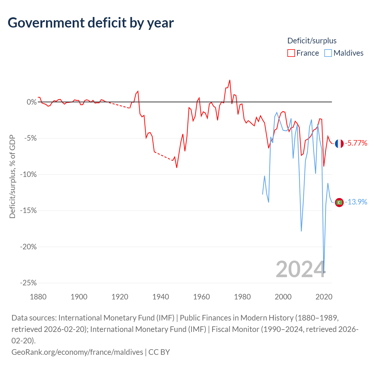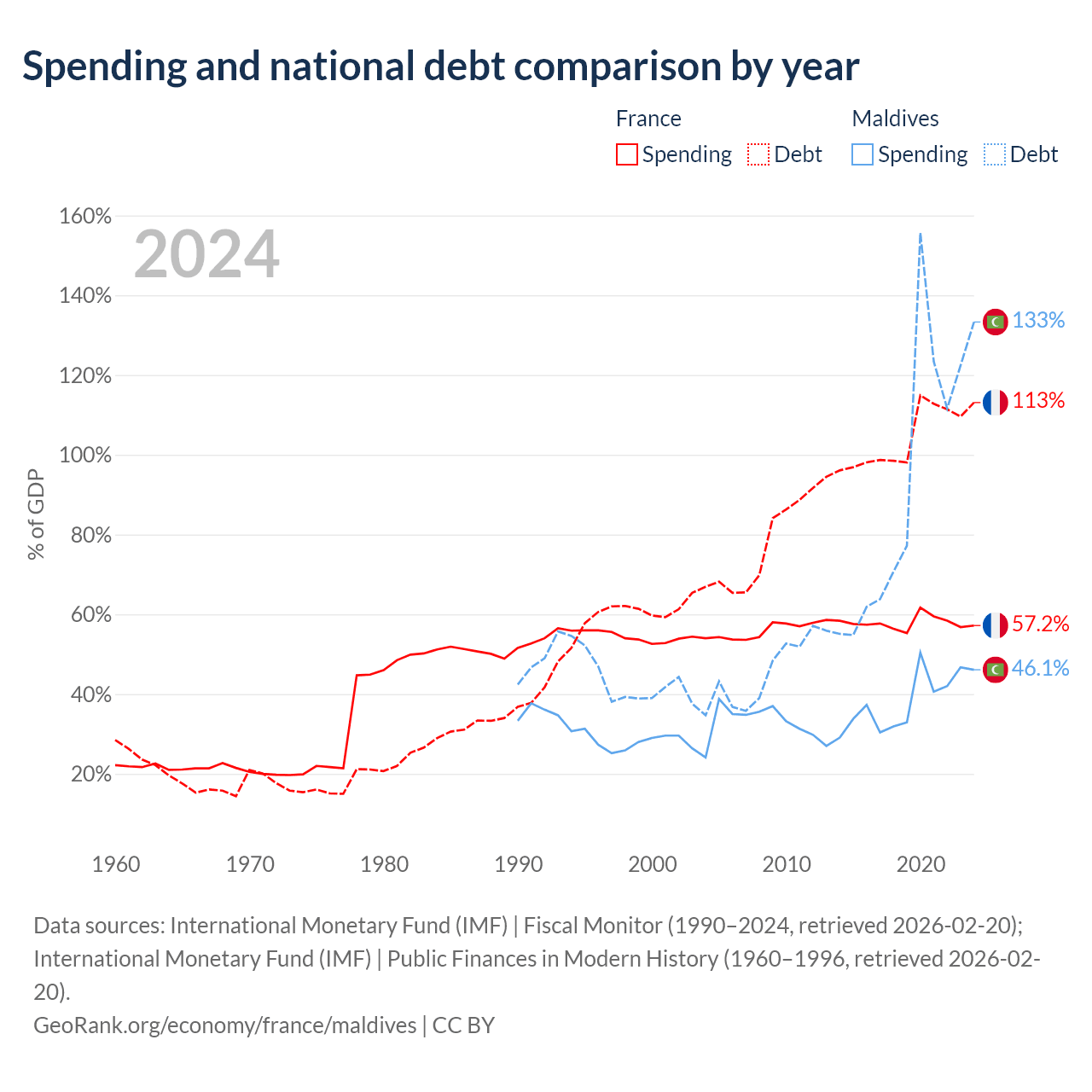 France has $3.58T in government debt (113.1% of GDP), compared to $9.41B (133.3% of GDP) in Maldives.