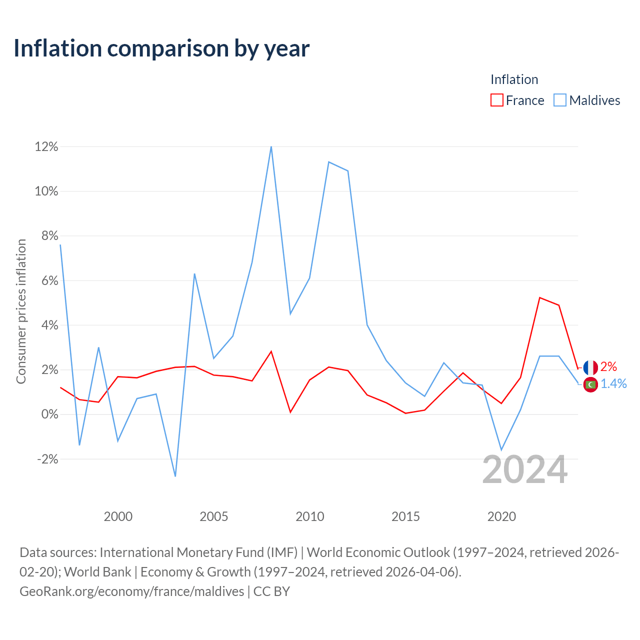 France has a GDP of $3.16T compared to $7.06B for Maldives, ranking 7/197 and 159/197 by economy size, respectively.