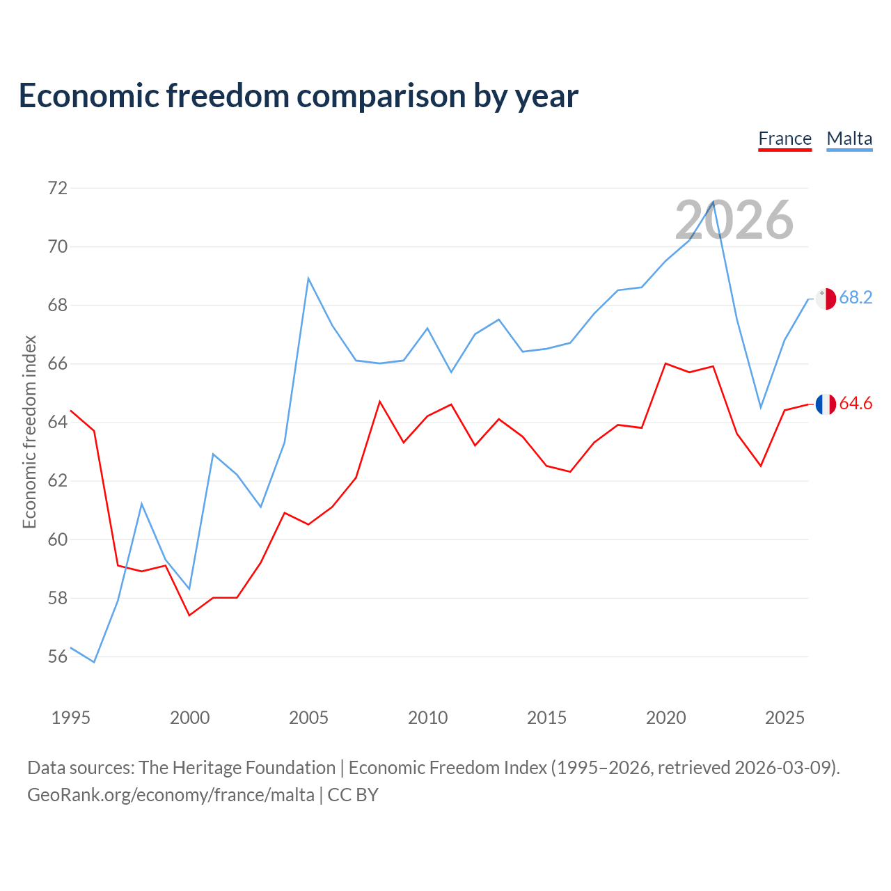 The Economic Freedom Index for France is 64.6, ranking 72/197, compared to 68.2 for Malta, ranking 49/197. The chart above displays a comparison of annual changes in economic freedom indexes.