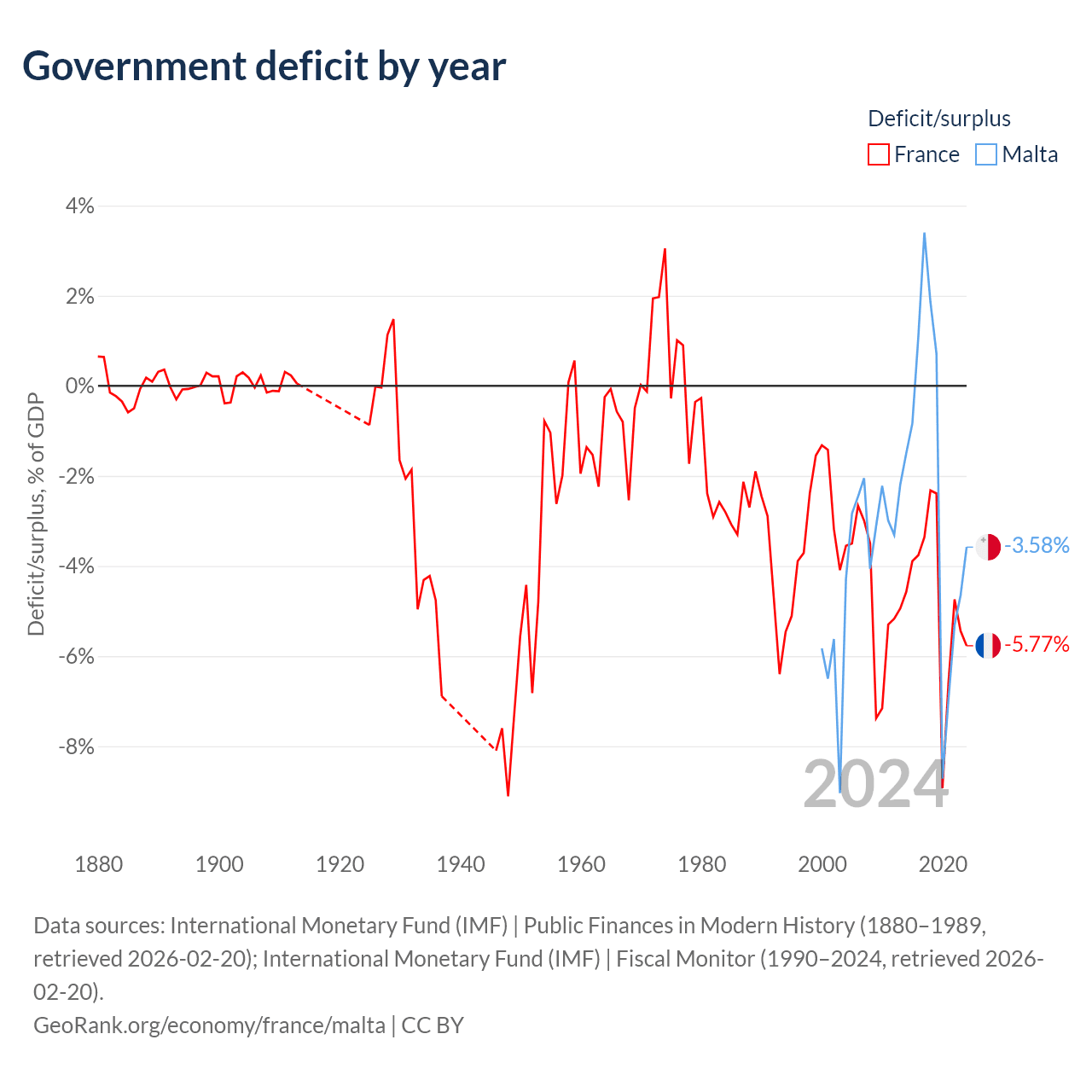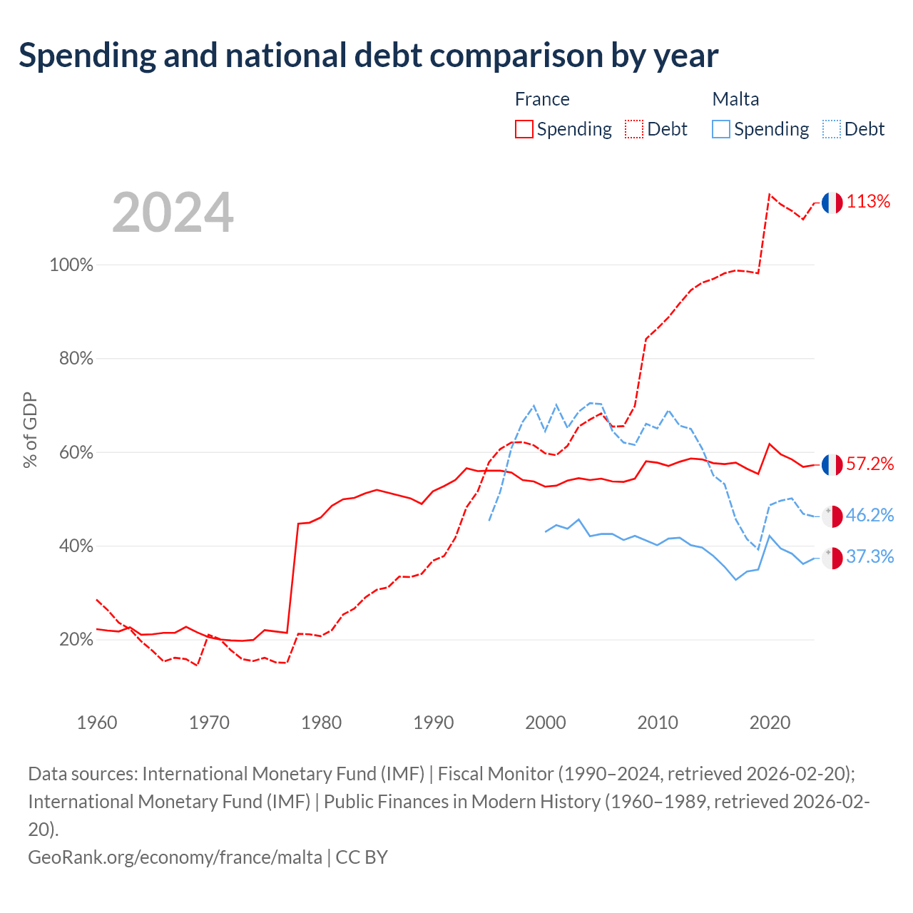 France has $3.58T in government debt (113.1% of GDP), compared to $11.5B (46.2% of GDP) in Malta.