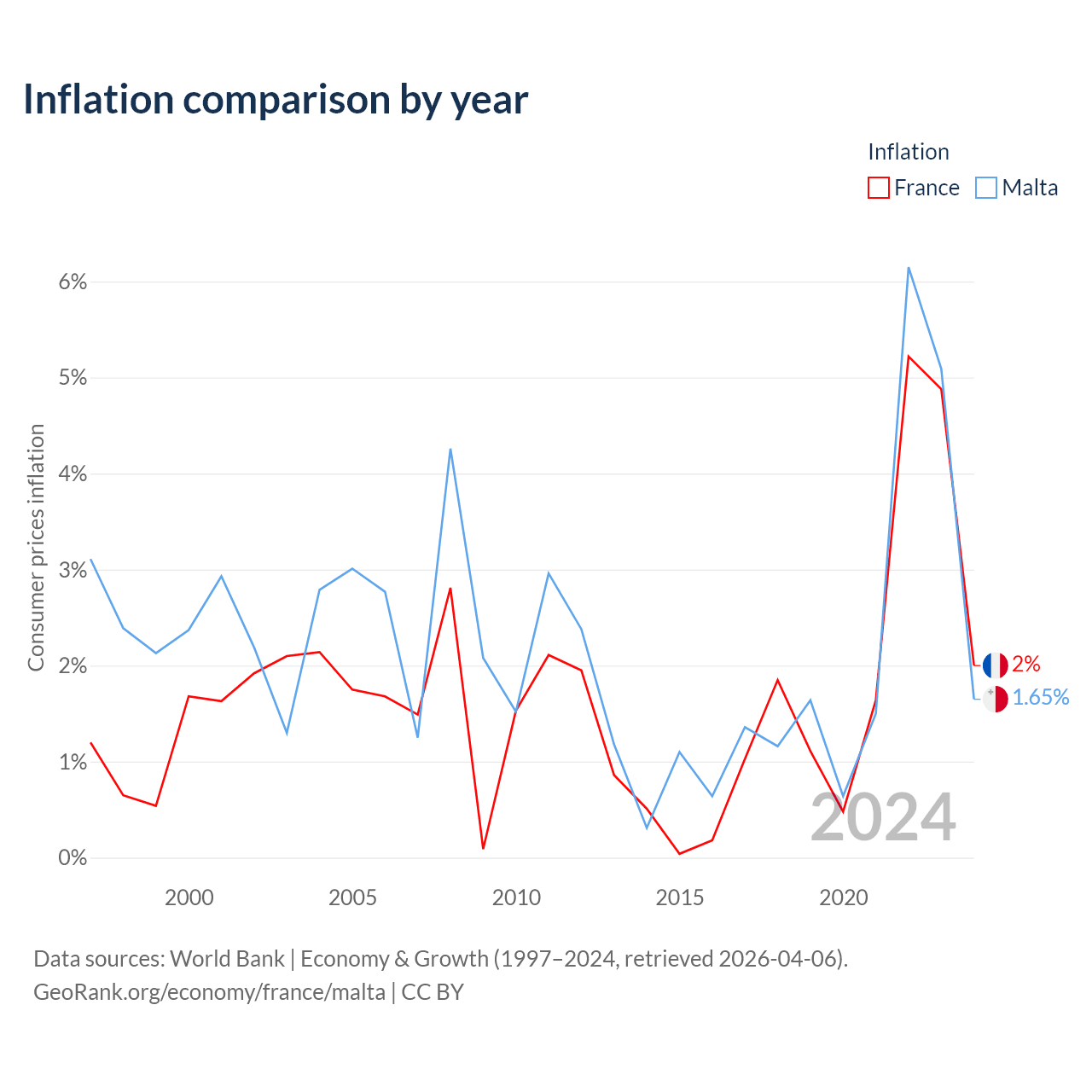 France has a GDP of $3.16T compared to $25B for Malta, ranking 7/197 and 119/197 by economy size, respectively.