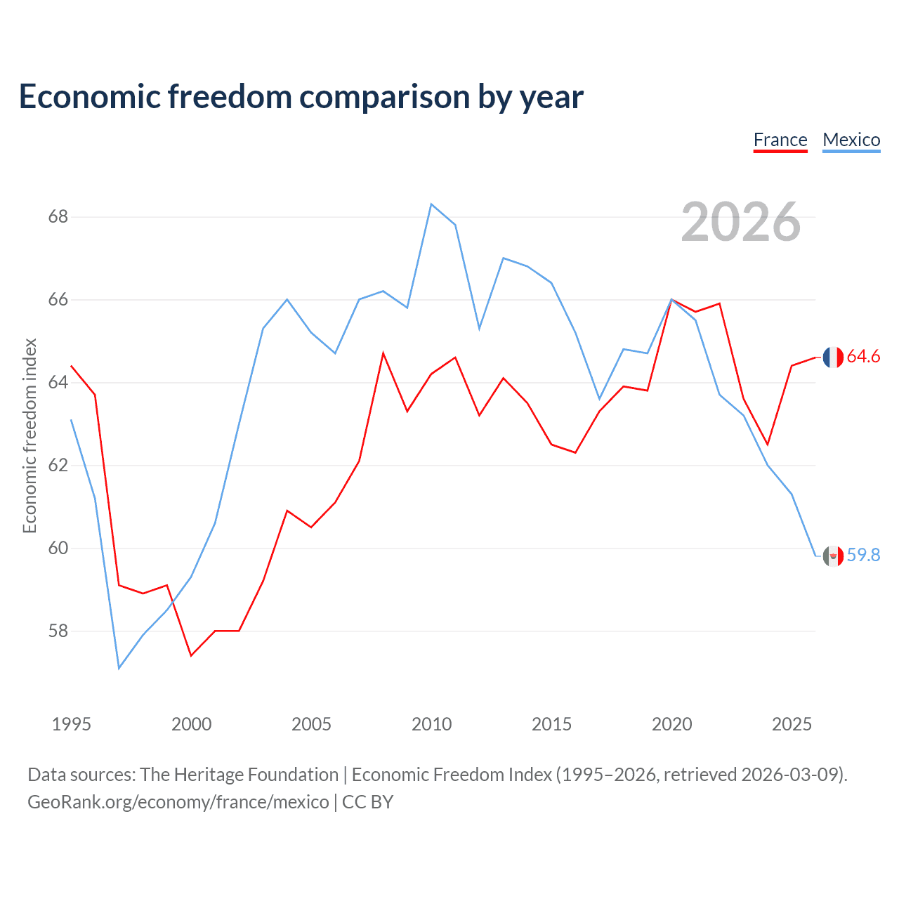 Data sources: The Heritage Foundation | Economic Freedom Index (1995–2026, retrieved 2026-03-09).
