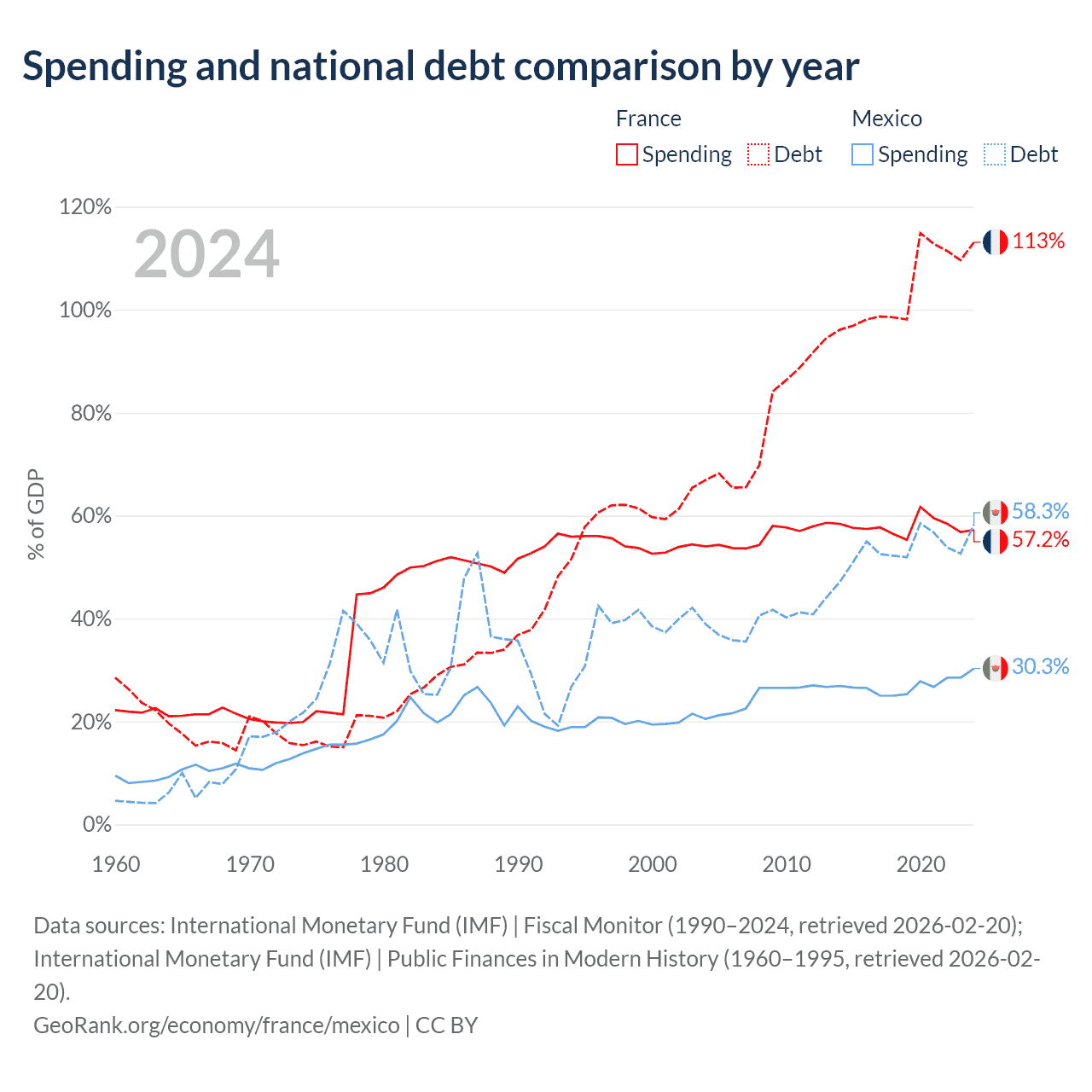 France has $3.58T in government debt (113.1% of GDP), compared to $1.08T (58.3% of GDP) in Mexico.