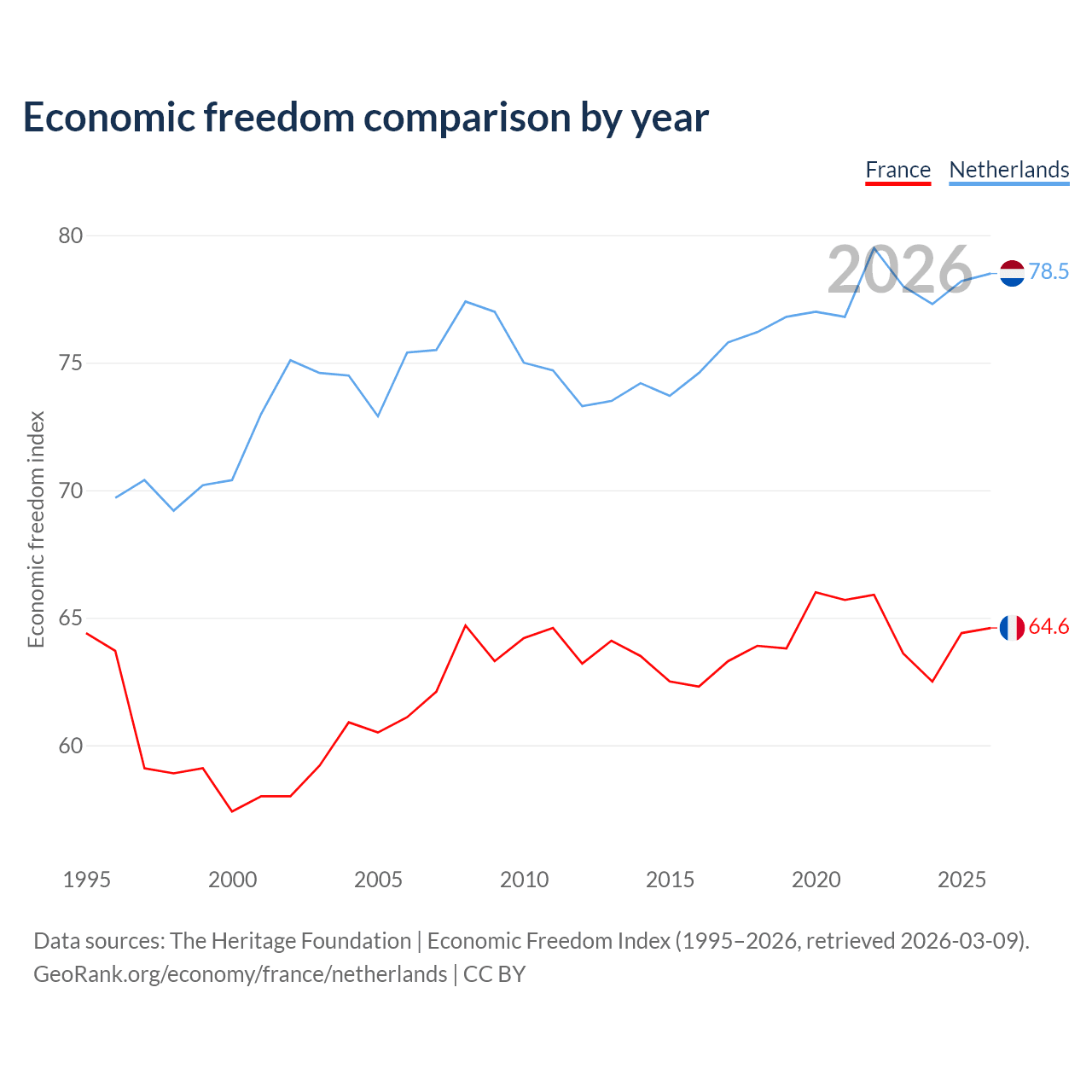 The Economic Freedom Index for France is 64.6, ranking 72/197, compared to 78.5 for the Netherlands, ranking 11/197. The chart above displays a comparison of annual changes in economic freedom indexes.