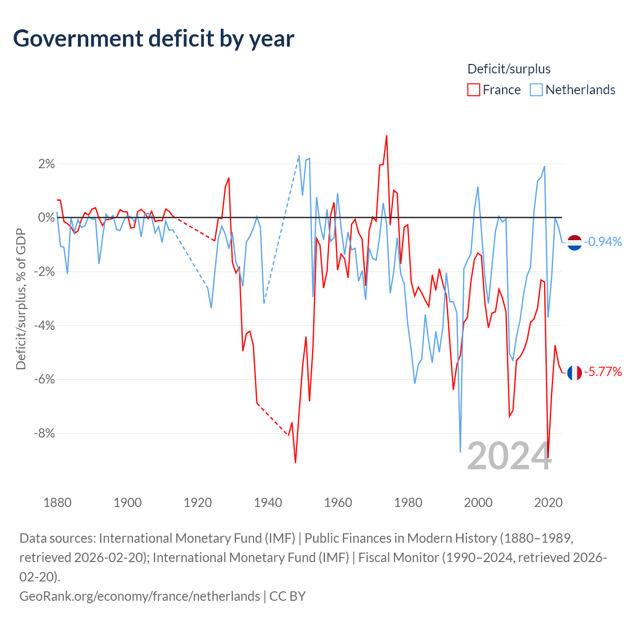 France has $3.58T in government debt (113.1% of GDP), compared to $532B (43.8% of GDP) in the Netherlands.