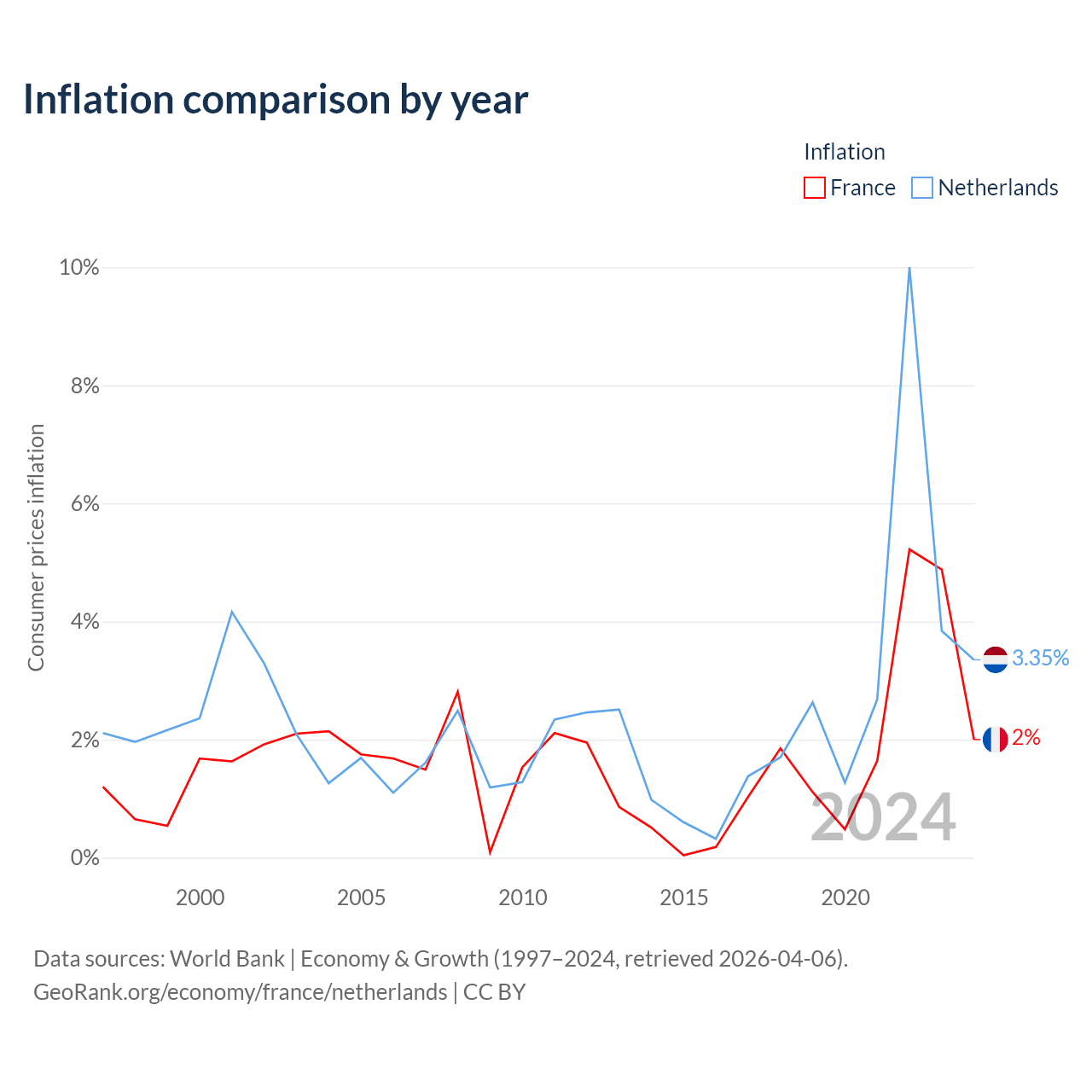 France has a GDP of $3.16T compared to $1.21T for the Netherlands, ranking 7/197 and 19/197 by economy size, respectively.