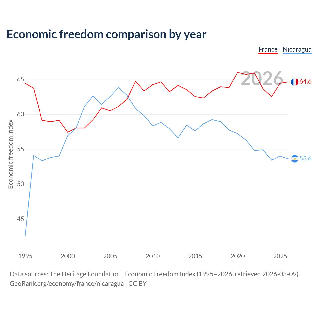 The Economic Freedom Index for France is 64.6, ranking 72/197, compared to 53.6 for Nicaragua, ranking 139/197. The chart above displays a comparison of annual changes in economic freedom indexes.