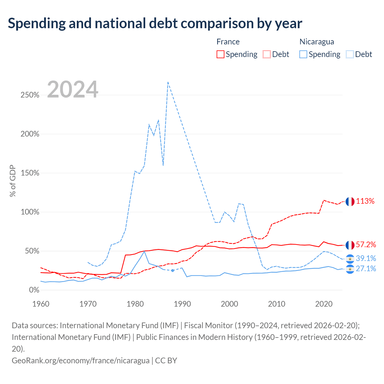 France has $3.58T in government debt (113.1% of GDP), compared to $7.71B (39.1% of GDP) in Nicaragua.