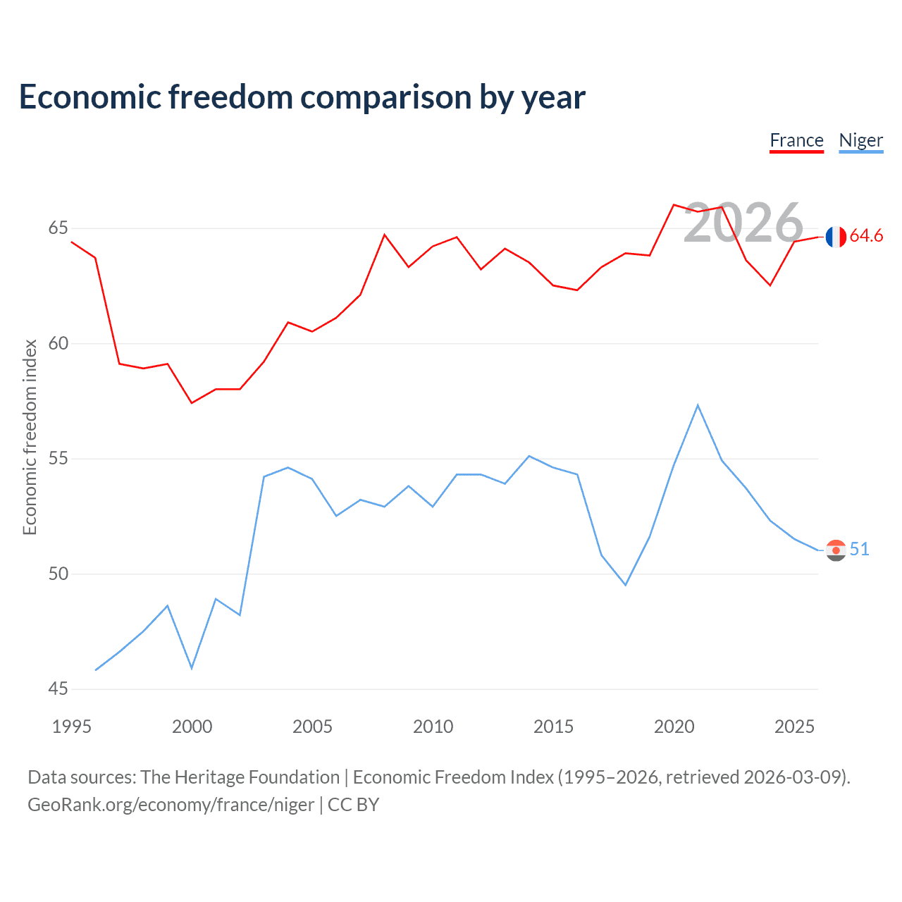 The Economic Freedom Index for France is 64.6, ranking 72/197, compared to 51 for Niger, ranking 156/197. The chart above displays a comparison of annual changes in economic freedom indexes.